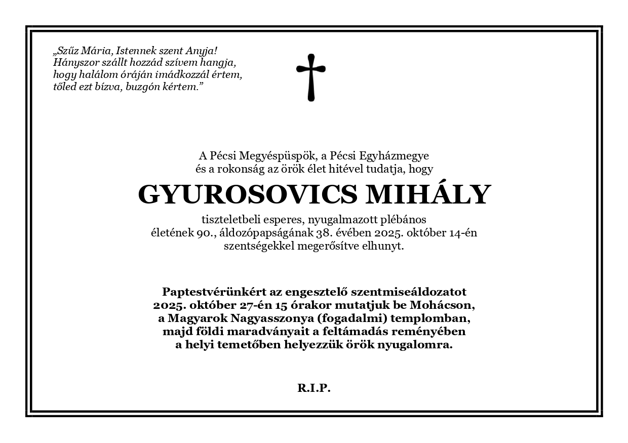 A Pécsi Megyéspüspök, a Pécsi Egyházmegye és a rokonság az örök élet hitével tudatja, hogy GYUROSOVICS MIHÁLY tiszteletbeli esperes, nyugalmazott plébános életének 90., áldozópapságának 38. évében 2025. október 14-én szentségekkel megerősítve elhunyt.