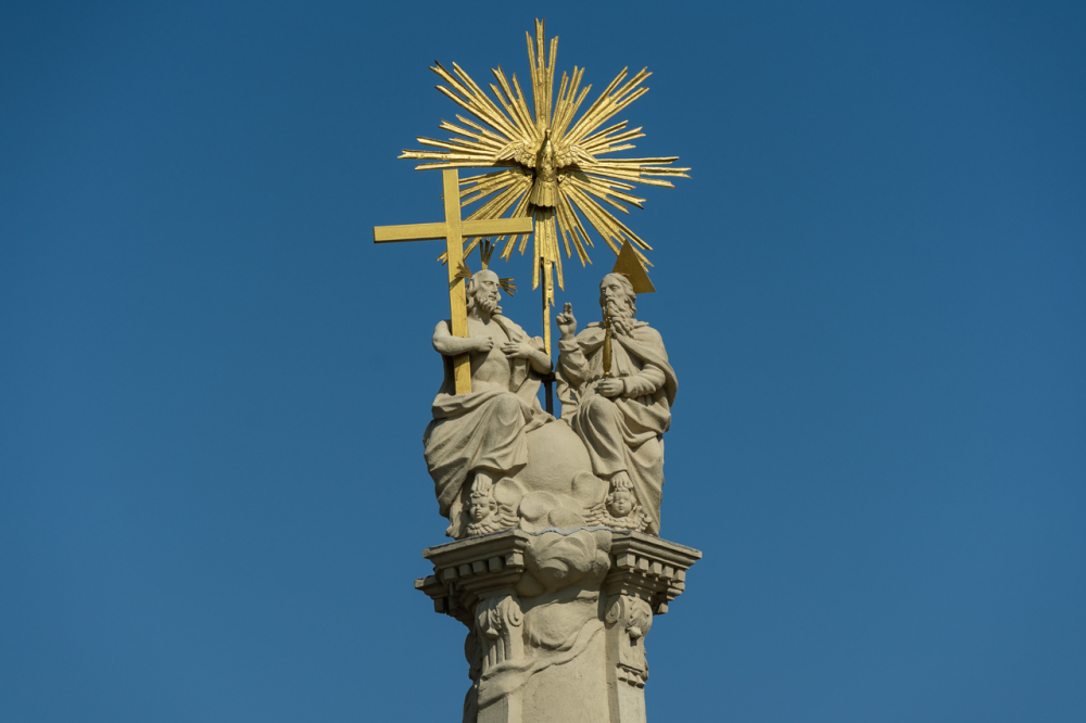 A barokk szobrok hagyományai szerint helyet kapott az emlékművön az önmegtagadásban és magányban folytonos imádságos életet élt Szent Rozália is, akit egy barlangban, fekvő helyzetben ábrázolnak.
