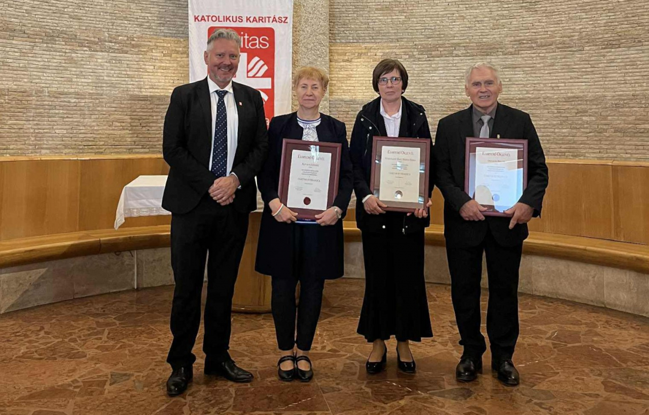 A Pécsi Egyházmegye Karitász-önkéntesei közül az idén Caritas Hungarica díjban részesült: Kovács Jánosné (Szekszárd), Osztafin Miklós (Hőgyész) és Veszelkáné Maul Márta Mária (Bóly). A kitüntetésben részesülők elismerő oklevelet, egy különleges Karitász-jelvényt és a díjazottakat méltató kiadványt vehettek át Fekete Szabolcs Benedek püspök elnöktől, Zagyva Richárd országos igazgatótól, és Besenczi Zsolttól, a Pécsi Egyházmegyei Katolikus Karitász igazgatójától.