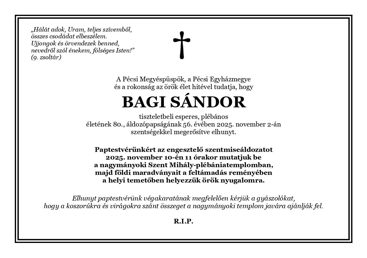 A Pécsi Megyéspüspök, a Pécsi Egyházmegye és a rokonság az örök élet hitével tudatja, hogy BAGI SÁNDOR tiszteletbeli esperes, nyugalmazott plébános életének 80., áldozópapságának 56. évében 2025. november 2-án szentségekkel megerősítve elhunyt.