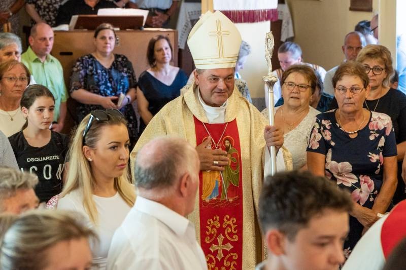 Felföldi László pécsi megyéspüspök szentbeszédében az ünnep, hálaadás, szeretet és közösség szerepét és fontosságát hangsúlyozta. Kifejezte örömét, hogy a közösség tagjai ilyen szépen megadják a módját az ünneplésnek, melyre – mint mondta – nem Istennek van szüksége, hanem nekünk, embereknek. Ilyenkor ünneplőbe öltözünk és az ünnep kiemel minket a hétköznapok egyhangúságából.