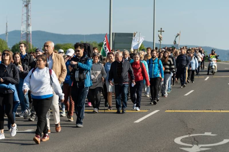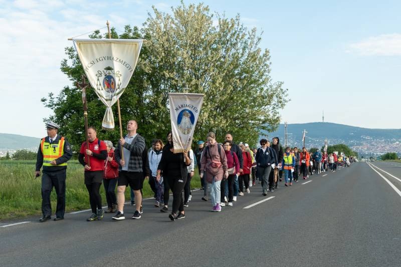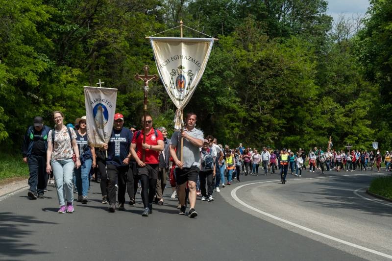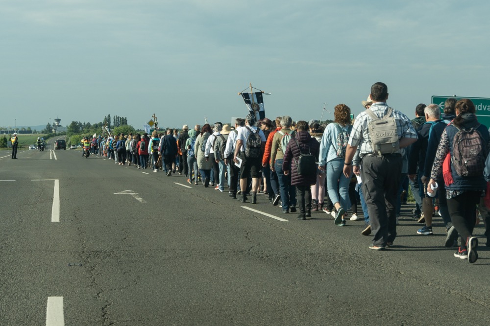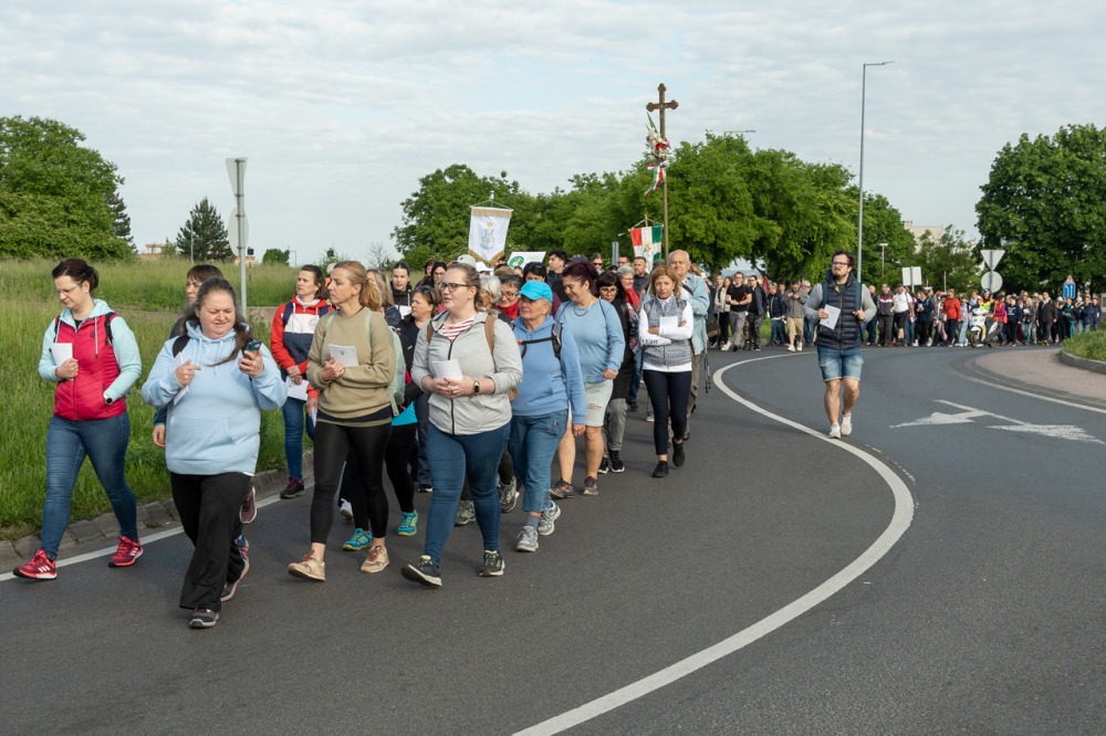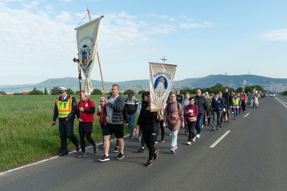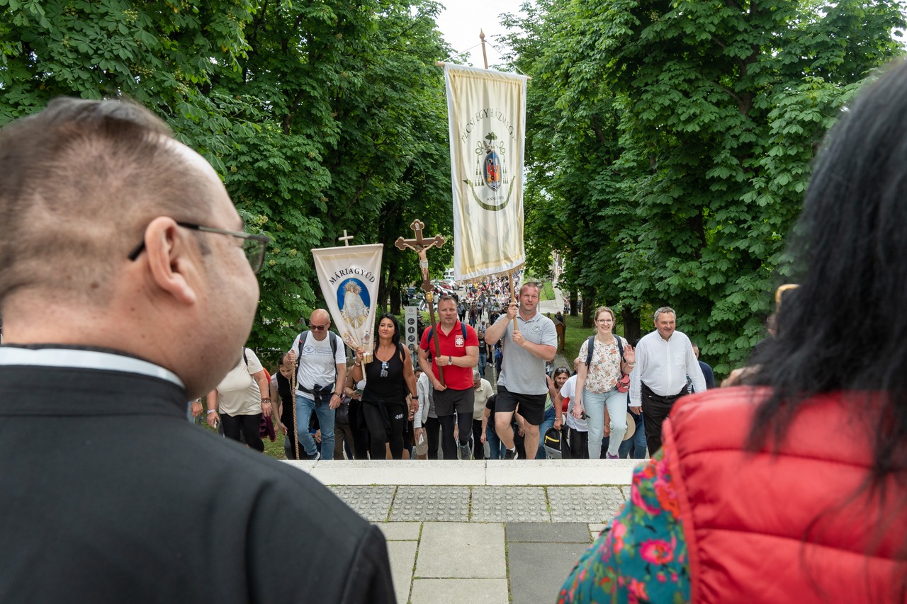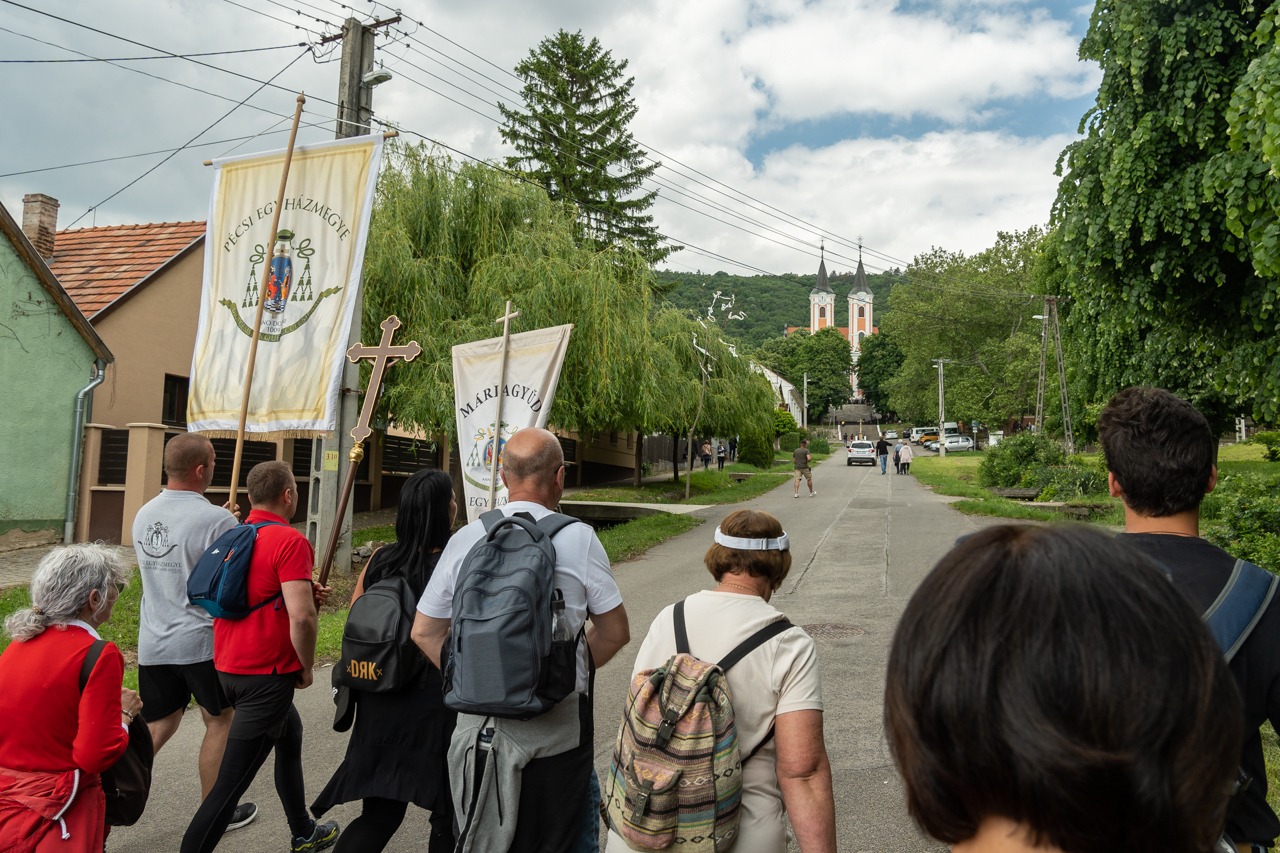A feszület és a zászló mögött haladó zarándokok imádkozva, sokszor a gondolataik csendjében tették meg az olykor fárasztó és a testnek fájdalmat jelentő vagy épp örömteli és békét adó kilométereket. Majd hatóra úton lét után lassan feltűntek a máriagyűdi bazilika páros tornyai, melyek ezúttal is szelíd szeretettel köszöntötték a megfáradt zarándokokat.