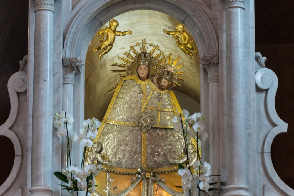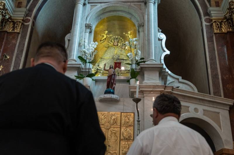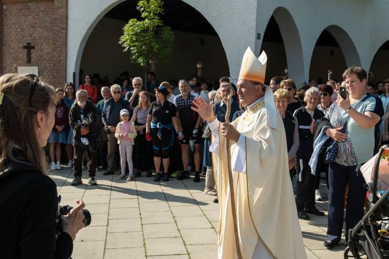A templom előtti lépcsősor tetején harangzúgás közepette fogadta a tömeg a zarándokokat. Keresztes Andor, a bazilika plébánosa személyesen köszöntötte a főpásztort és a híveket, akik a bazilikában található Mária-kegyszobor előtt közös imádságban mondtak hálát a zarándoklat megérkezésének kegyelmi ajándékaiért, hogy aztán a szentmise liturgiájában az Oltáriszentségben velünk lévő Krisztussal találkozzanak.
