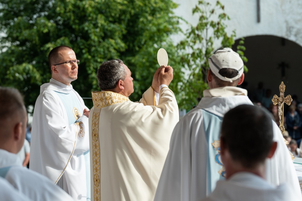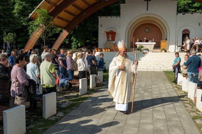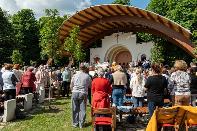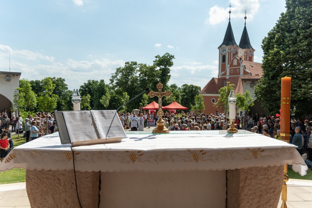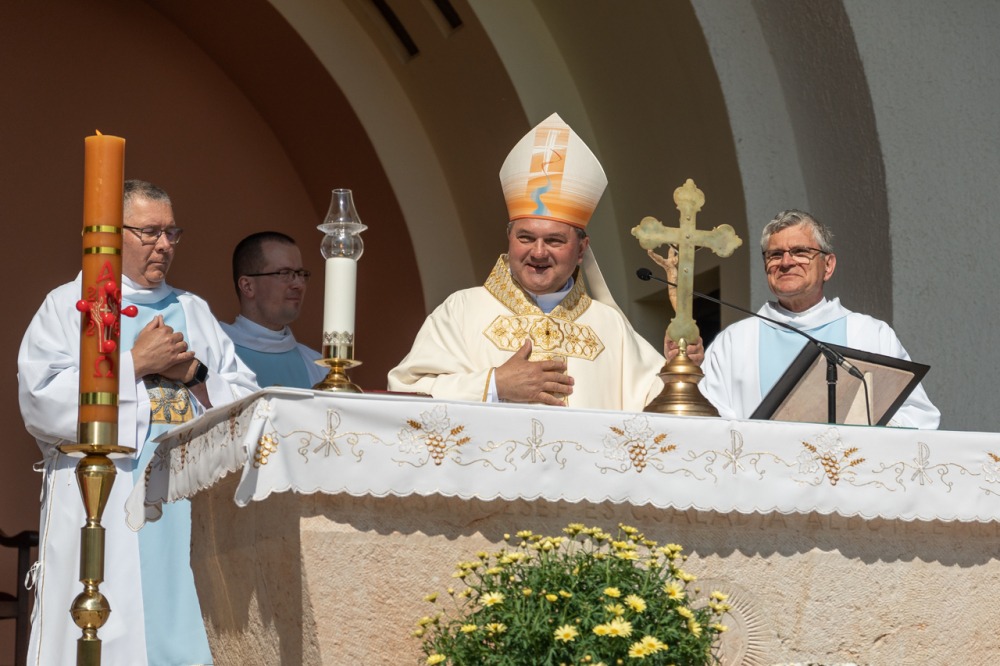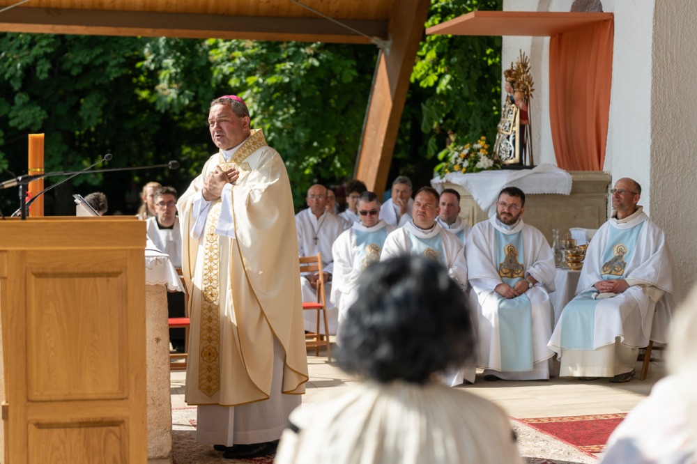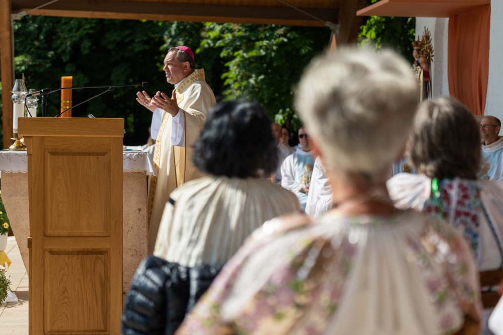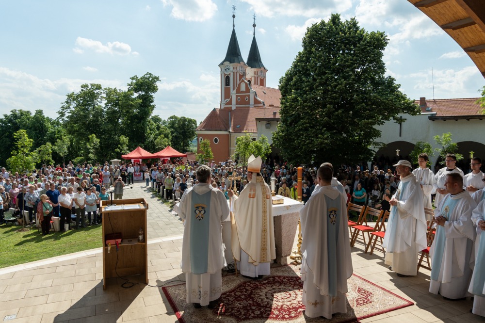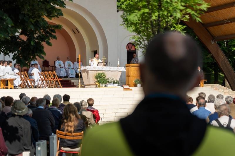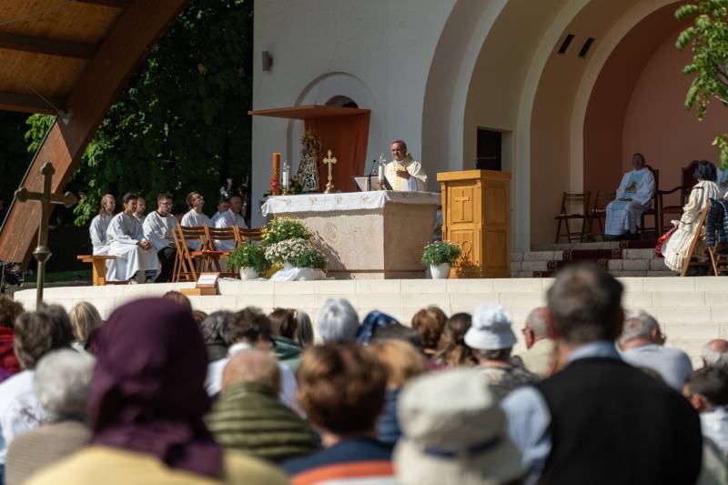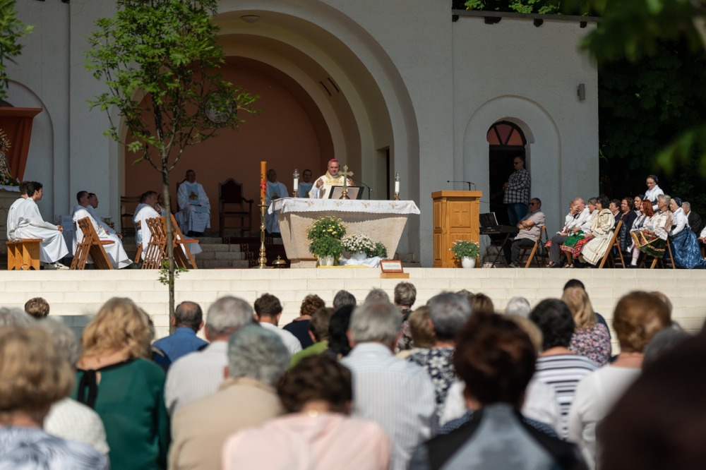 A kegyhely szabadtéri oltáránál bemutatott szentmise elején Felföldi László megyéspüspök köszönetet mondott és kifejezte háláját a zarándoklat találkozásaiért és a személyes beszélgetések lehetőségeiért, majd a szívekben hordozott imaszándékok közül emelt ki néhányat.