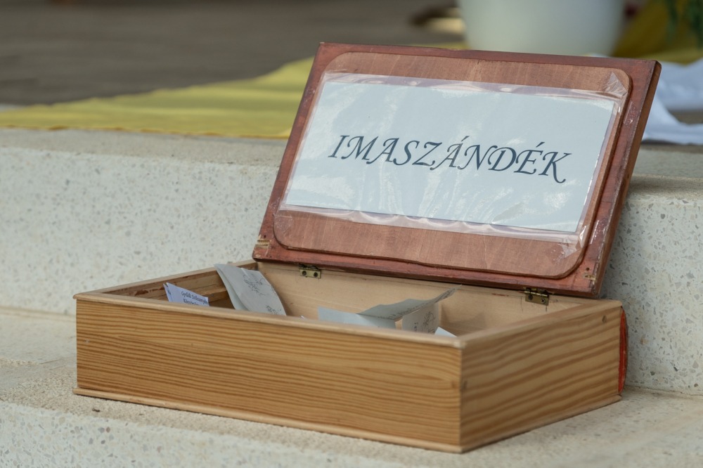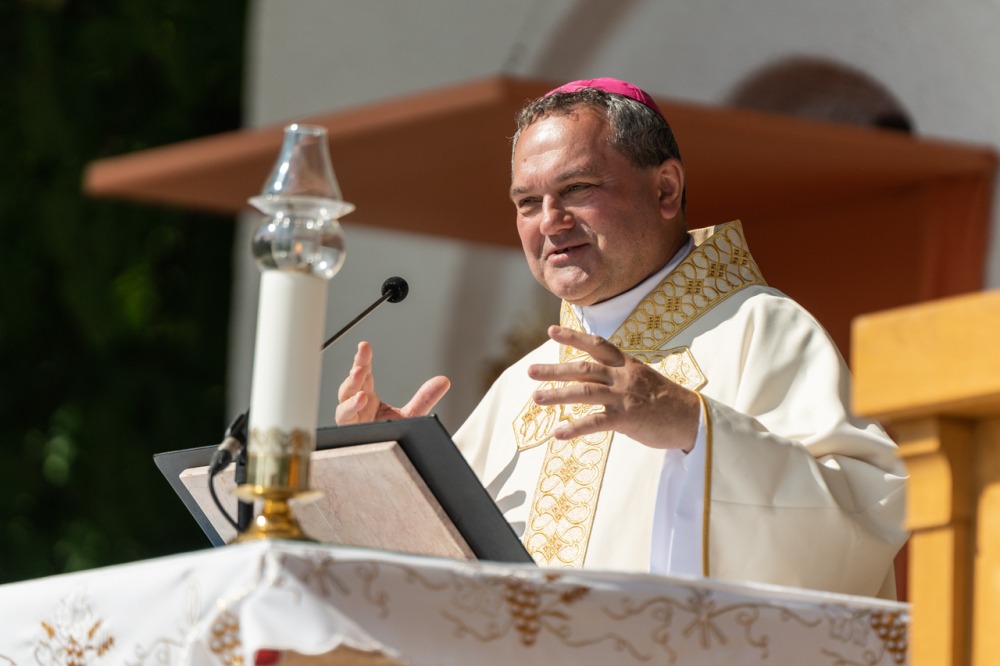 A zarándokok vele megosztott imaszándékai közül néhányat kiemelve a főpásztor a Jóisten elé helyezett életutak keresztjeit és szenvedéseket, köztük egy kárpátaljai család kényszertoborzással elvitt gyermekének halálát, egy súlyos beteg unoka életét, akinek a gyógyulásáért a nagymama zarándokolt Máriagyűdre, továbbá egy fiatalon elhunyt édesapa családjának gyászát. Mint mondta: „Isten jóságos szeretetébe és bizalmába helyezve vegyünk részt ezen a szentmisén, hálaadással, hogy végigjöhettünk ezen az úton, hogy csatlakozhattunk a zarándoklathoz azokért is, akik itt vártak ránk. Adjunk hálát azért, hogy mindnyájan jelen lehetünk a Szűzanya oltalma alatt hálaadással, hogy együtt terjesszük imáinkat a mennyei Atyánkhoz” – hangzott a főpásztori kérés.