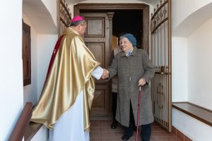 A püspök régi szép szokás szerint a templomajtóban búcsúzott a hívektől.