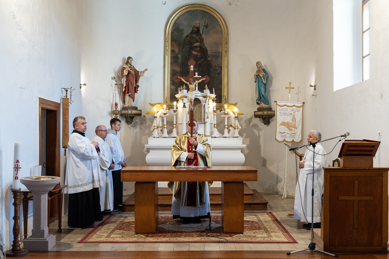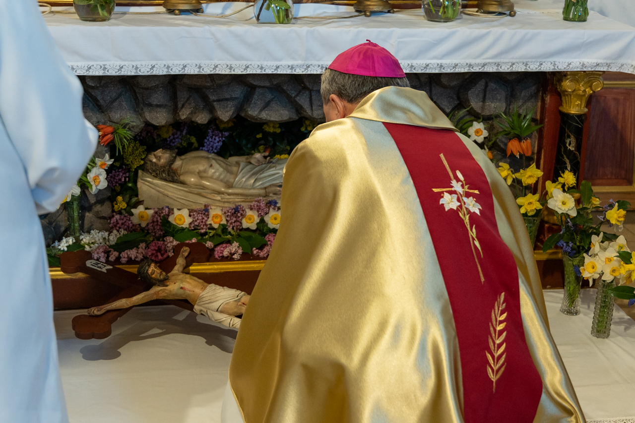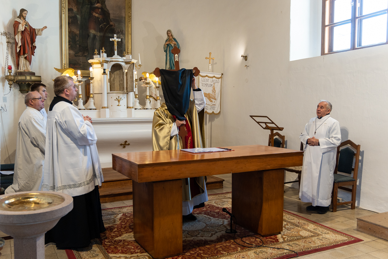 Ősi hagyomány szerint nagypénteken Egyházunk nem mutat be szentmisét, a Jézust jelképező oltár lecsupaszítva áll. Szentlászlón a főpásztor és a ministránsok csendben vonultak be a templomba, majd a püspök leborult az oltár, az önmagát kiüresítő Krisztus jelképe előtt.