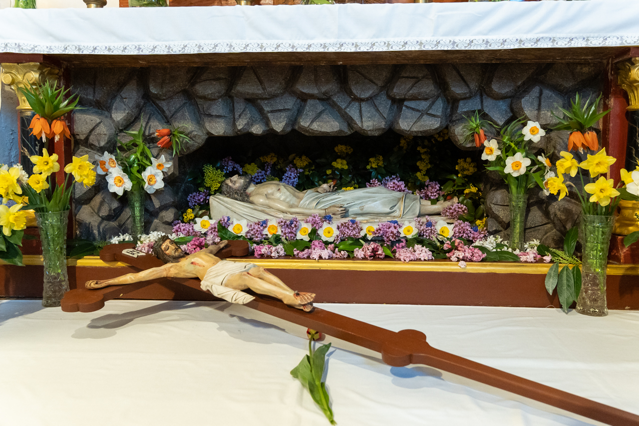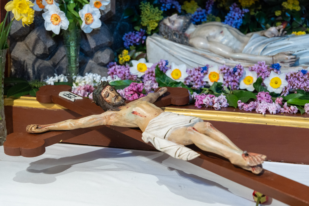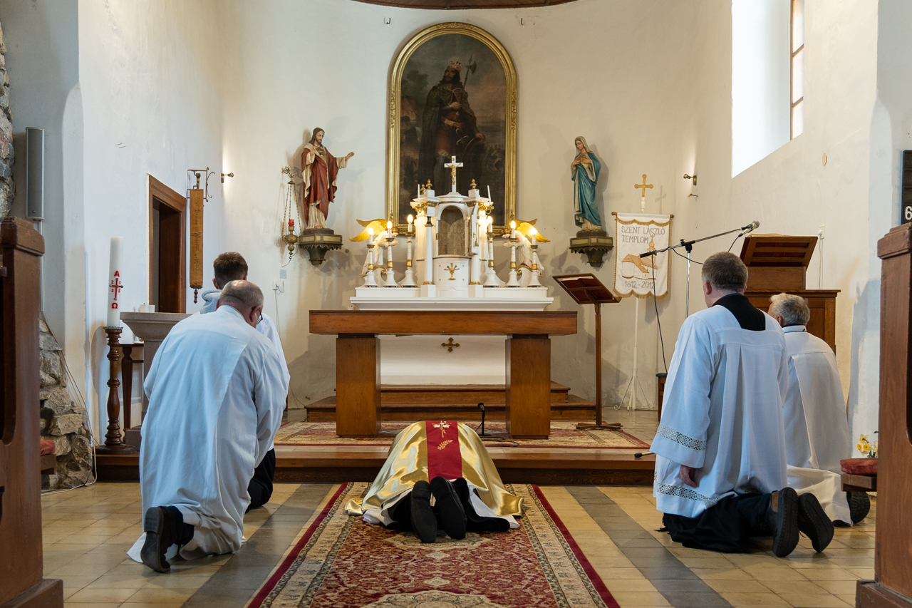 Ősi hagyomány szerint nagypénteken Egyházunk nem mutat be szentmisét, a Jézust jelképező oltár lecsupaszítva áll. Szentlászlón a főpásztor és a ministránsok csendben vonultak be a templomba, majd a püspök leborult az oltár, az önmagát kiüresítő Krisztus jelképe előtt.