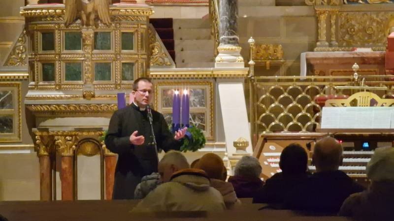 Amikor 1846. október 24-én Liszt Ferenc a Pécsi Püspökség vendége volt, a legenda szerint az erkélyről kihajolva a bazilika harangjaiból merített ihletet az Esztergomi mise komponálásához. Erre a történetre reflektál Varga Ferenc szobrászművész alkotása, melyet a Dóm téren, a püspökség erkélyén láthatunk. Bár a mostani koncert során elhangzó Liszt-művek mindegyike évekkel a leírt esemény után keletkezett, a szerző az erkélyen állva a bazilika harangjai helyett ezúttal annak orgonáját hallgathatta, hiszen a Liszt-dallamok átszűrődtek az adventi fénybe burkolózó téren.