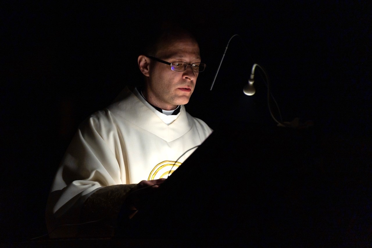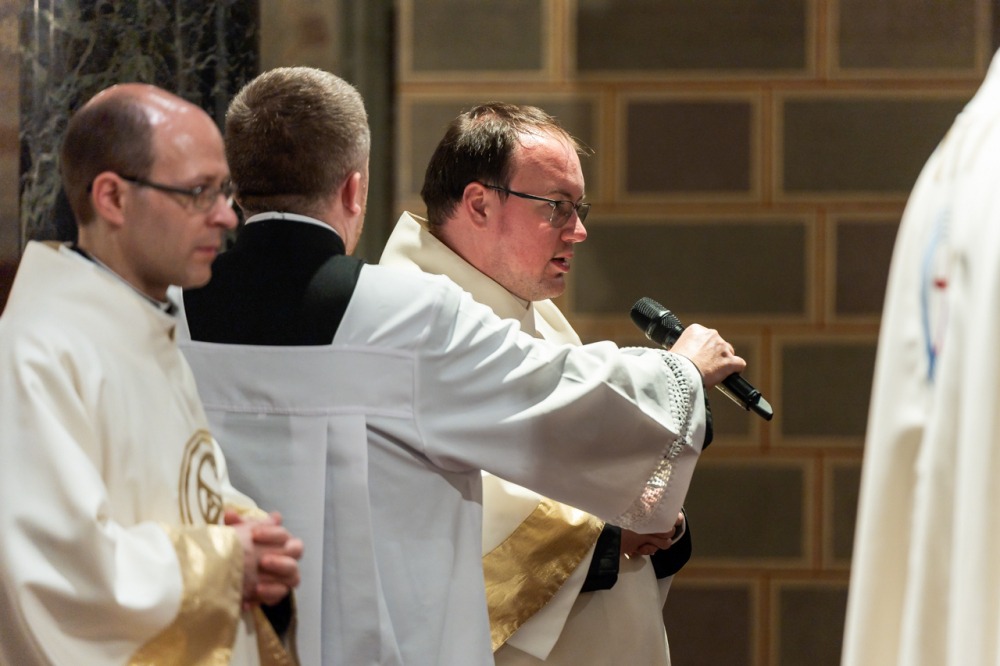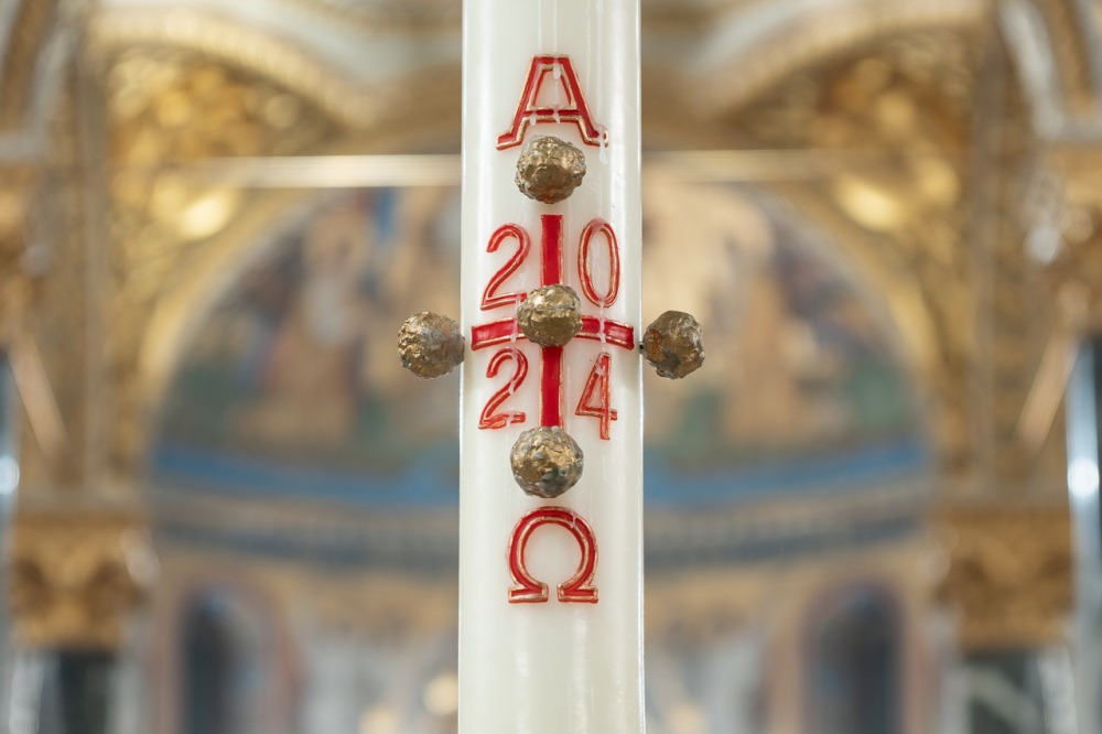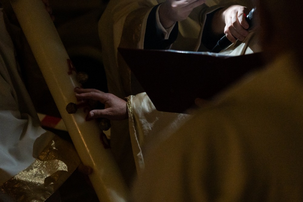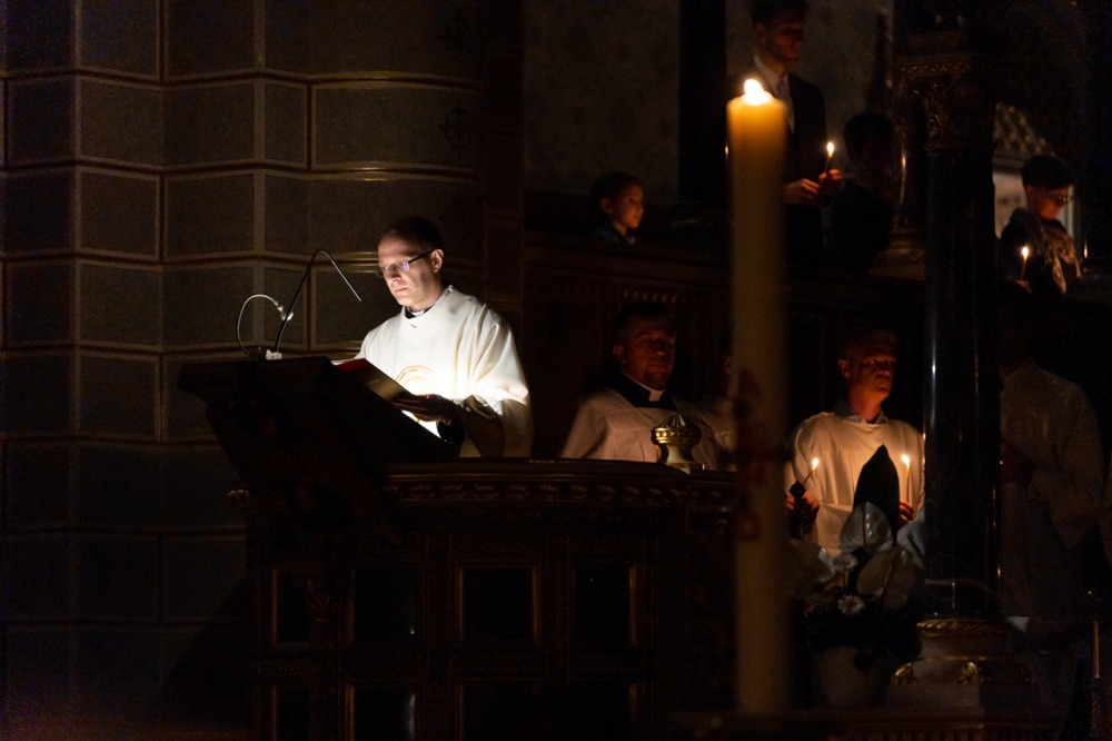 A liturgiában felcsendült az Exultet gyönyörű éneke, mely a húsvéti öröm kiáradását közvetítve sorolja fel az életünket átalakító kegyelmeket, melyek a húsvéti éjszakán fakadtak.