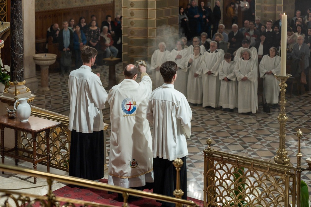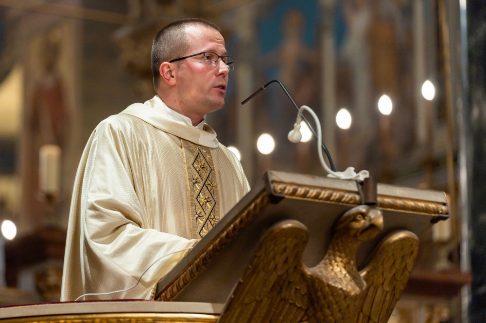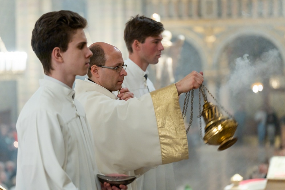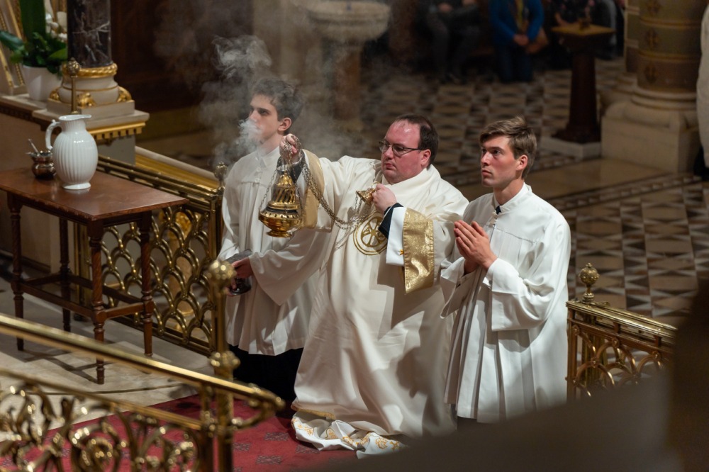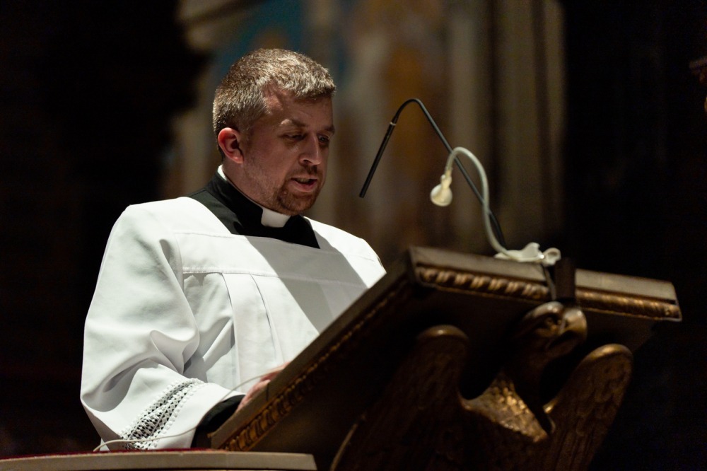 A liturgiában felcsendült az Exultet gyönyörű éneke, mely a húsvéti öröm kiáradását közvetítve sorolja fel az életünket átalakító kegyelmeket, melyek a húsvéti éjszakán fakadtak.