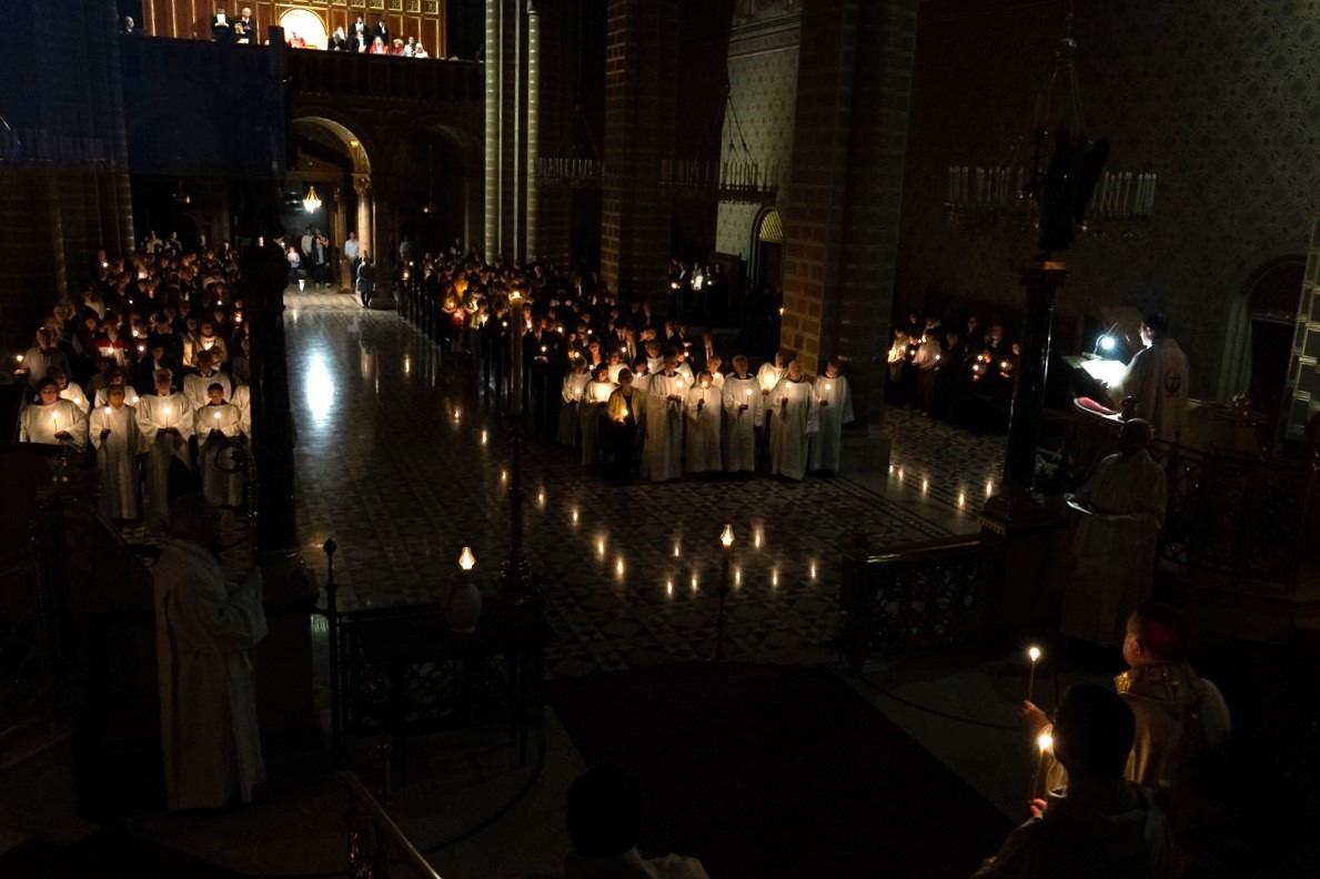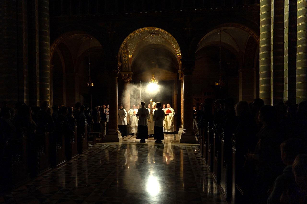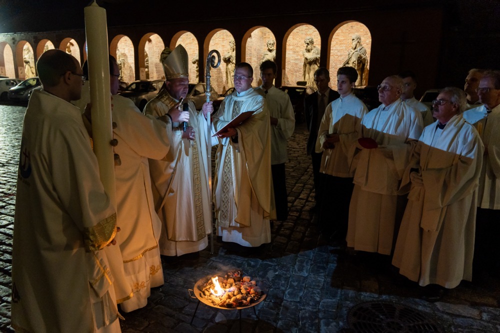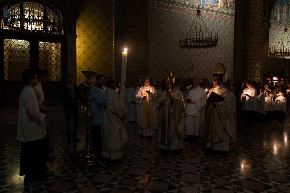 A főpásztor és asszisztenciája csendben vonult be a templomba húsvéti gyertyával, melynek lángját a hívek egymásnak adták tovább, a fellobbanó gyertyaláng fénye pedig lassanként betöltötte a székesegyházat, szimbolizálva Jézus dicsőséges feltámadását. Miközben a menet a húsvéti gyertyával a szentély elé érkezett, háromszor hangzott fel a Megváltó feltámadott életét ujjongva hirdető ének: Krisztus világossága! Istennek legyen hála!