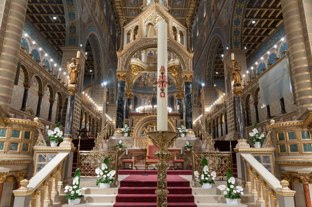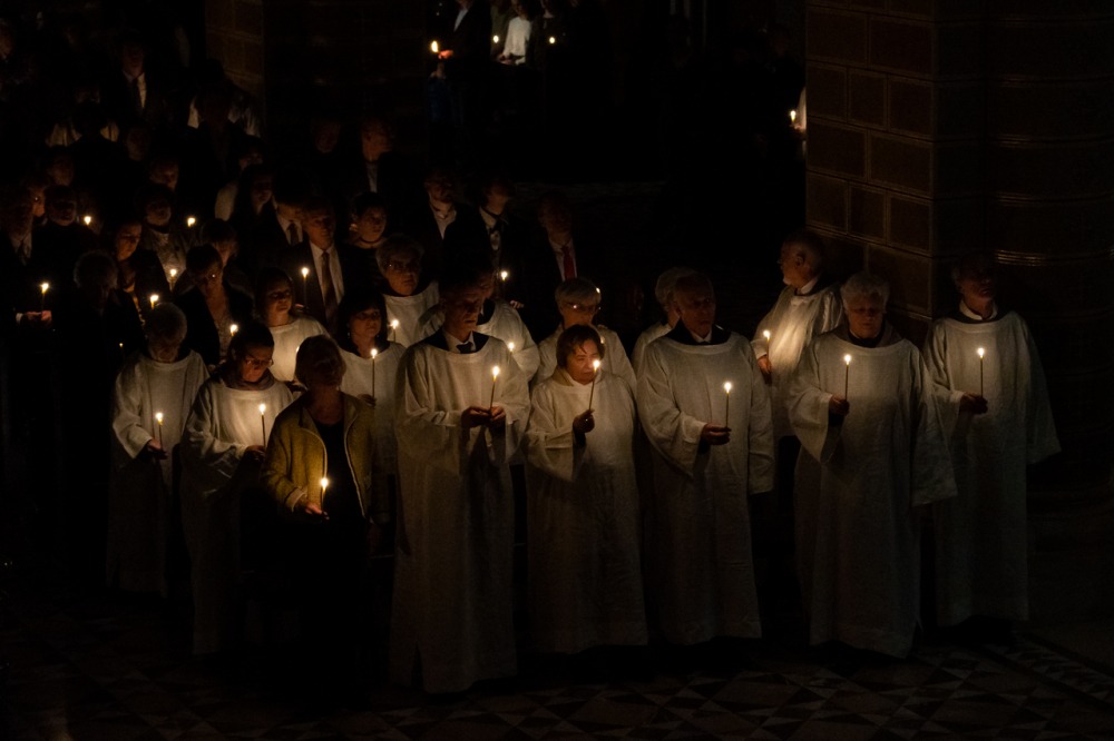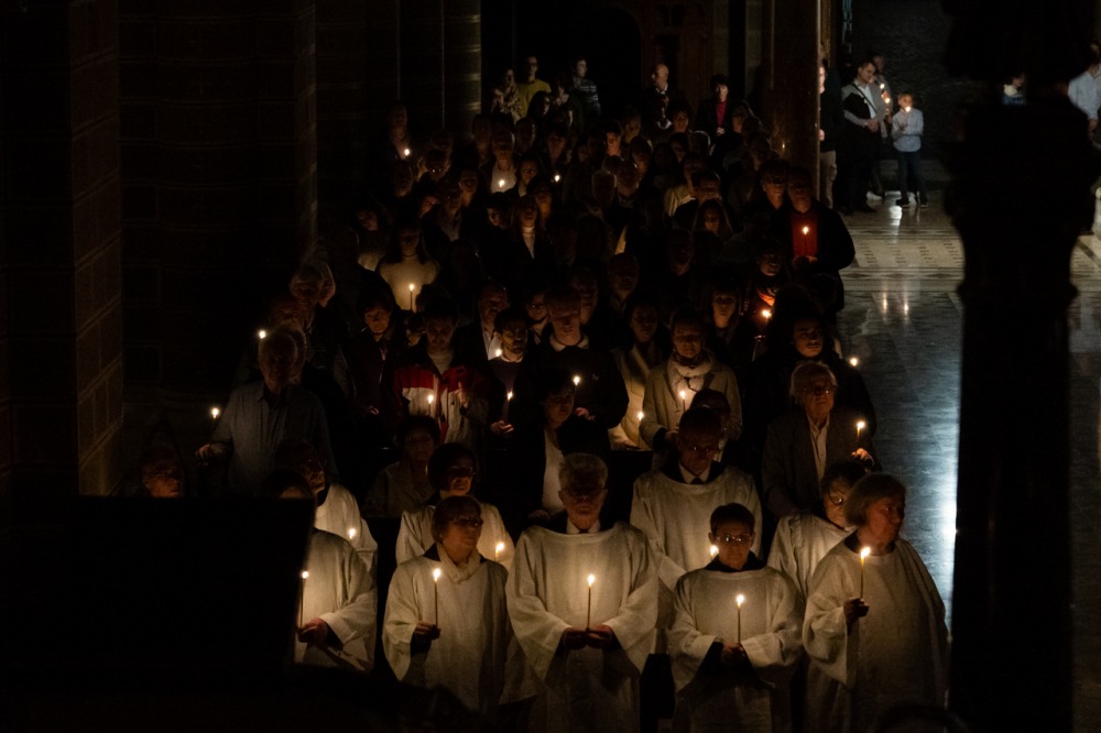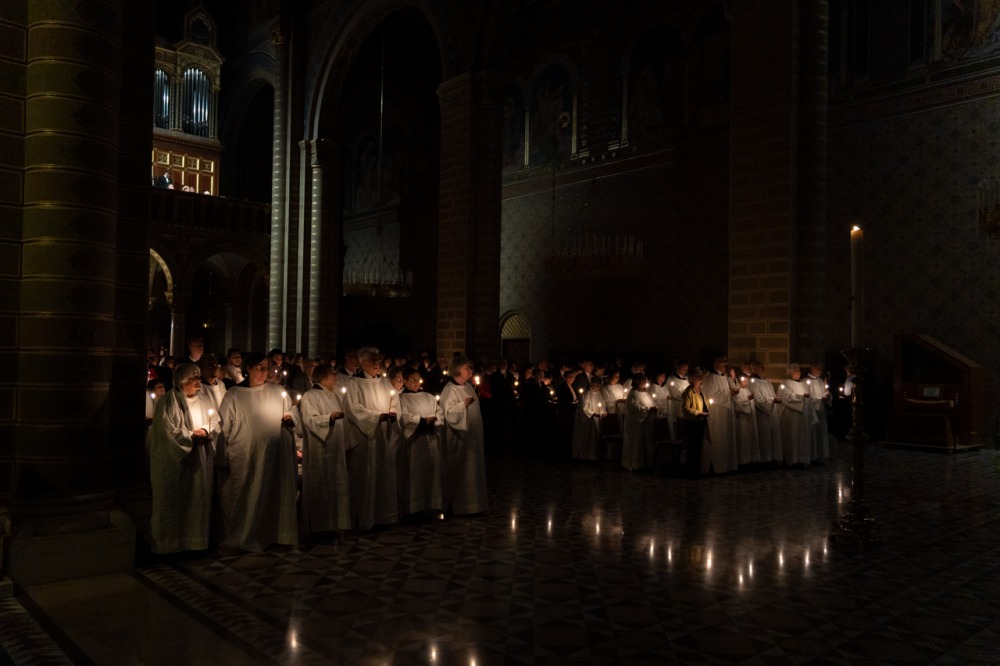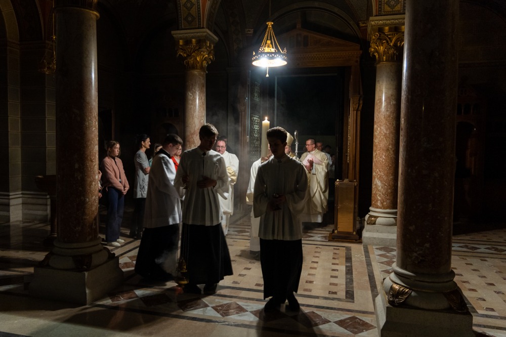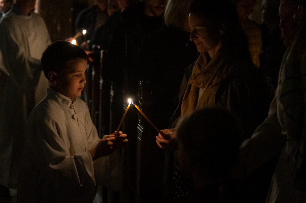 A főpásztor és asszisztenciája csendben vonult be a templomba húsvéti gyertyával, melynek lángját a hívek egymásnak adták tovább, a fellobbanó gyertyaláng fénye pedig lassanként betöltötte a székesegyházat, szimbolizálva Jézus dicsőséges feltámadását. Miközben a menet a húsvéti gyertyával a szentély elé érkezett, háromszor hangzott fel a Megváltó feltámadott életét ujjongva hirdető ének: Krisztus világossága! Istennek legyen hála!