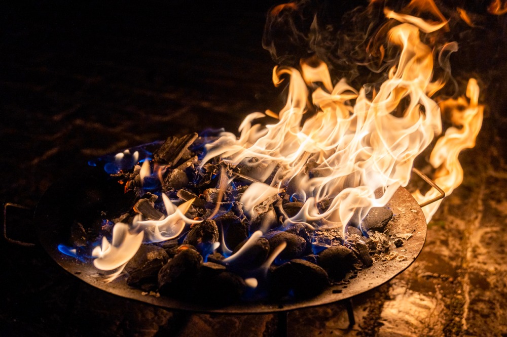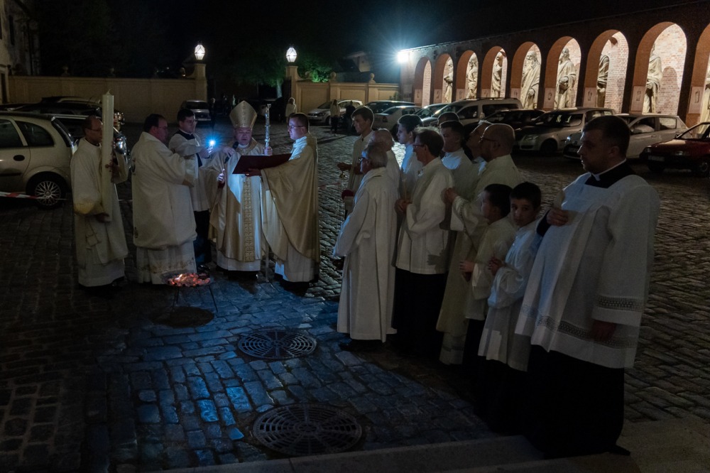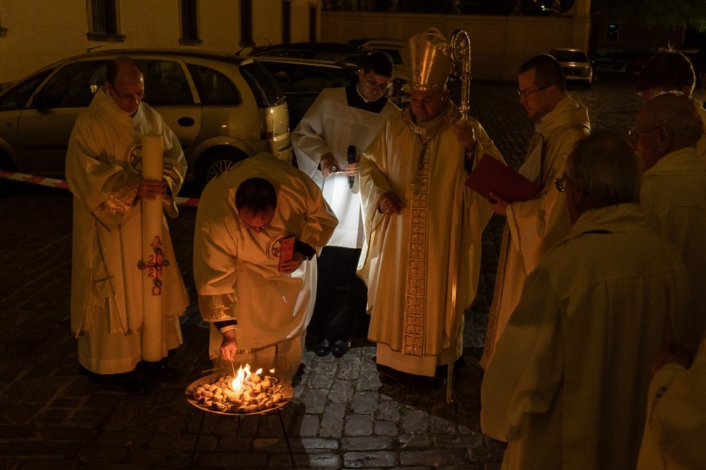 A szimbólumokban rendkívül gazdag liturgia kezdetén a sötétbe burkolózó templom előtti téren Felföldi László püspök a tűzszentelés szertartásában megáldotta a tüzet, melynek lángjával meggyújtották a Jézus élettelen testét szimbolizáló húsvéti gyertyát.