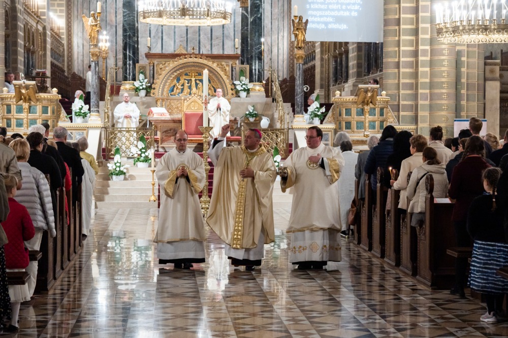 Ezt követően a főpásztor megáldotta a vizet, majd meghintette vele a híveket, akik kezükben a húsvéti gyertyájukkal, megújították keresztségi fogadásukat. A húsvéti vigília zárásában a püspök köszönetet mondott az egyházmegye papságának és minden szolgálattevőnek a nagyböjti előkészületben való közreműködésért, majd áldott ünnepet, csöndet, fényt és világosságot kívánt mindnyájunknak, hogy valóban öröm, szeretet és béke legyen mindenki szívében.
