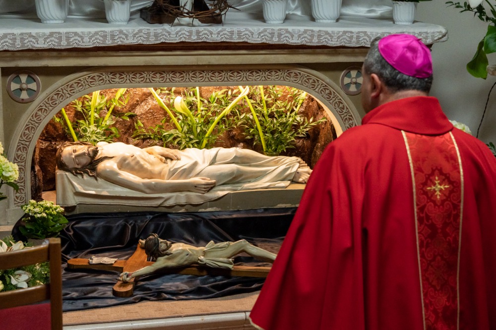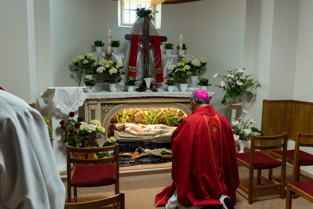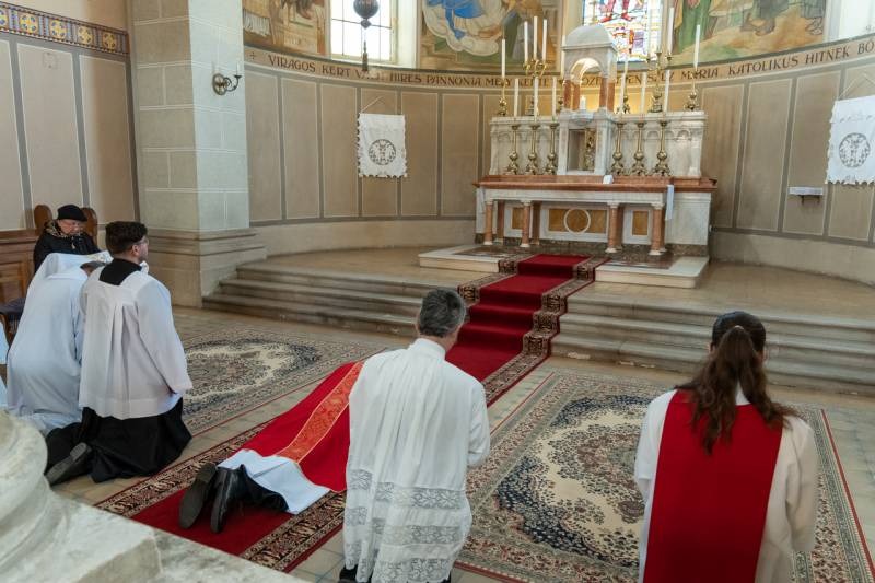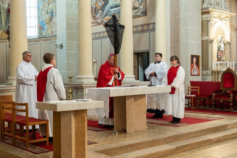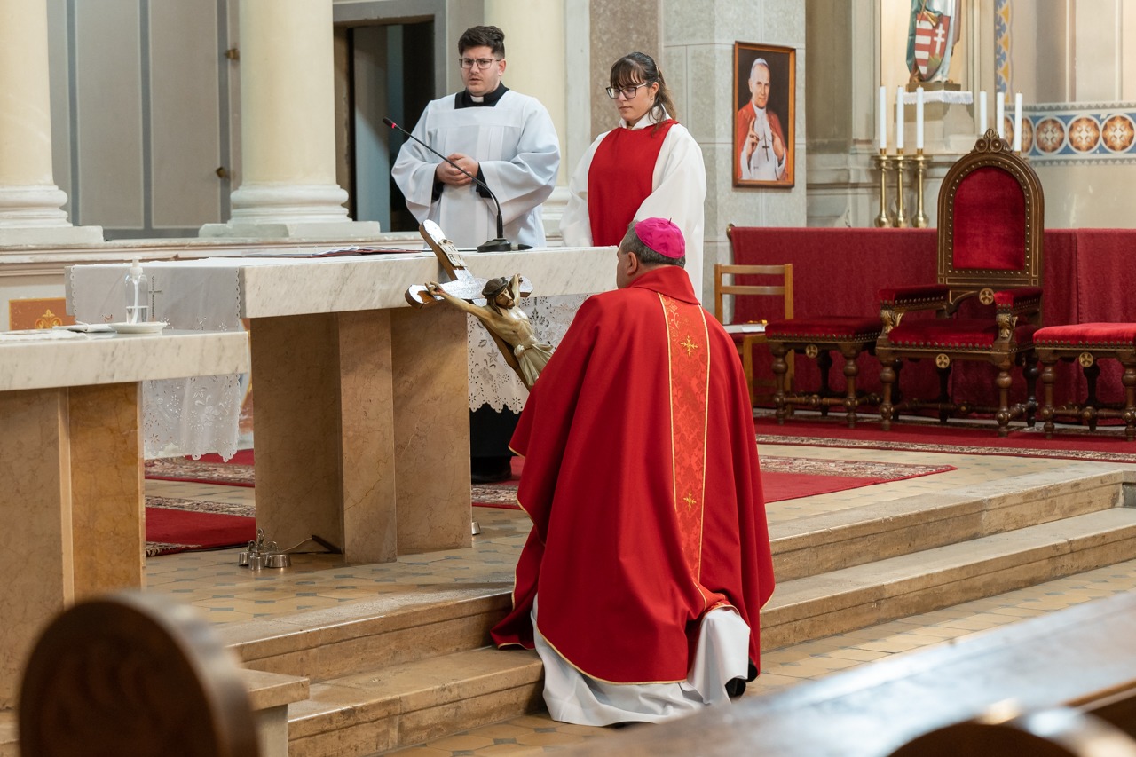 Nagypénteken egyházunk ősi hagyomány szerint nem mutat be szentmisét, a Jézust jelképező oltár díszek nélkül, lecsupaszítva állt a Szent Imre-templomban. A főpásztor és a ministránsok csendben vonultak be a templomba, majd a püspök leborult az oltár, az önmagát kiüresítő Krisztus jelképe előtt.