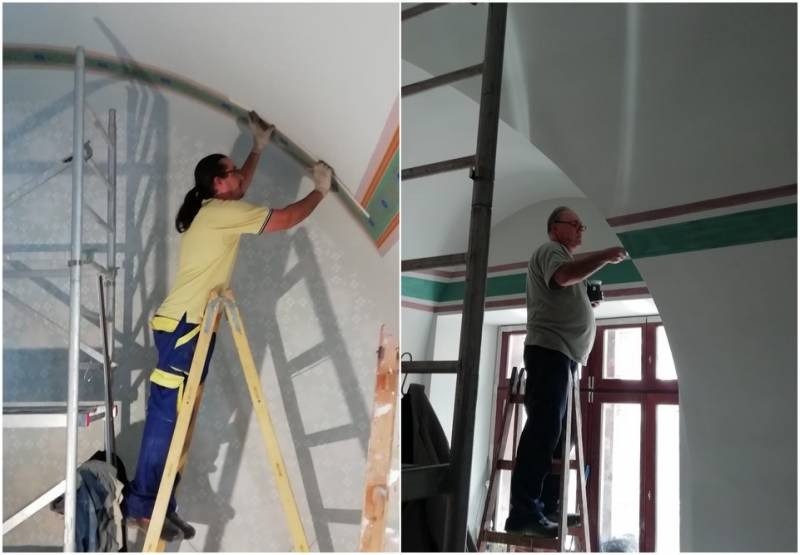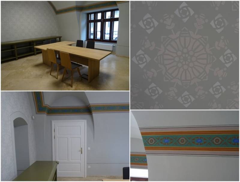 Csak a földszinti helyiség volt az, amely teljes egészében rekonstrukcióra alkalmas volt: ott az örökségvédelmi hatósággal egyeztetve a több rétegben található festések közül a 19. században készült két réteg közül a korábbit állították vissza, a tanúfelületek meghagyásával. [2] A rekonstrukciós festést Varga Péter felügyeletével Matosics Ferenc és Tar Árpád készítette el. [3]