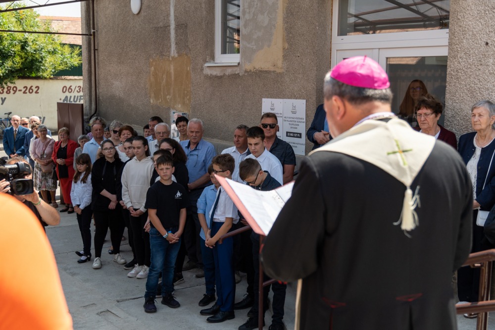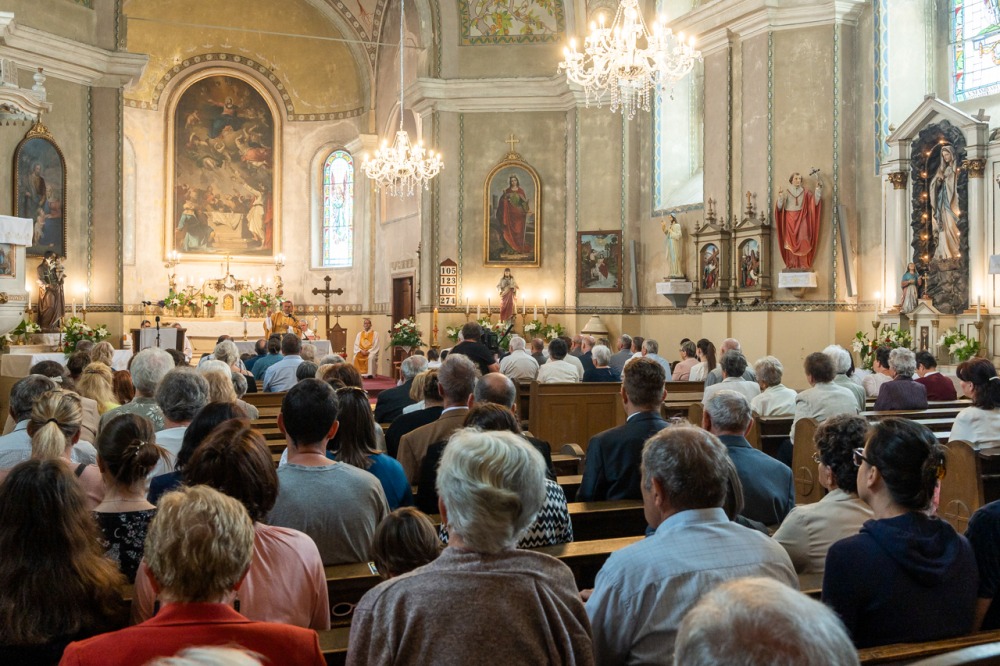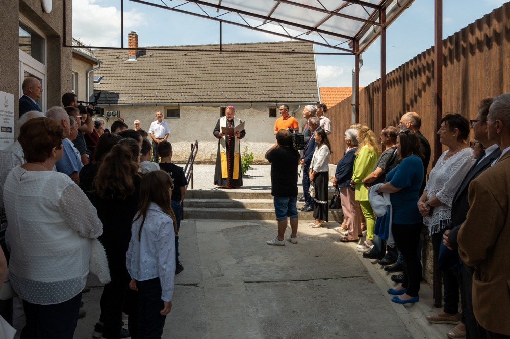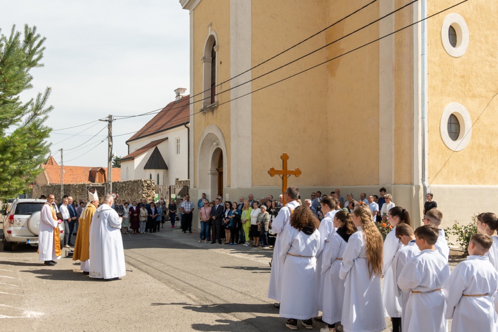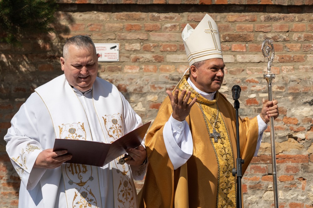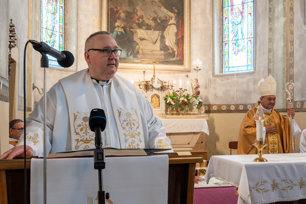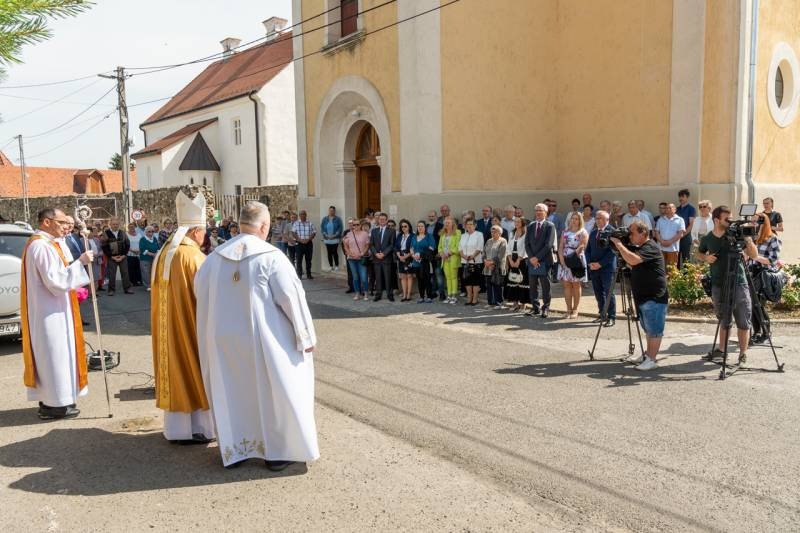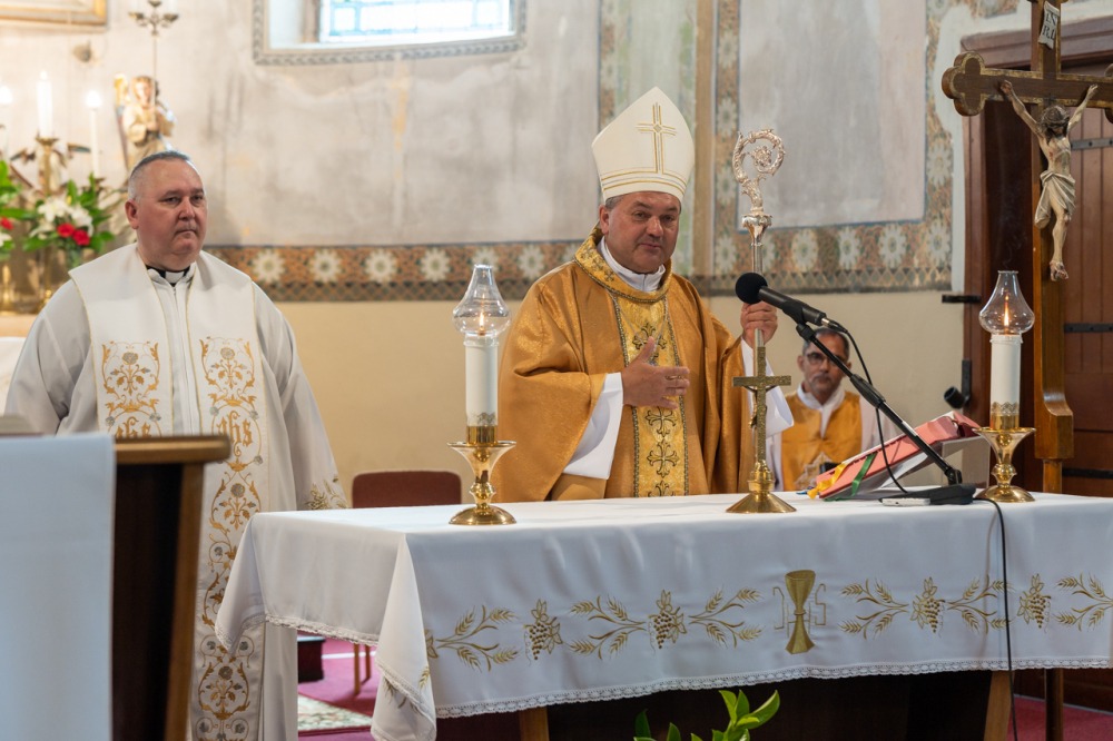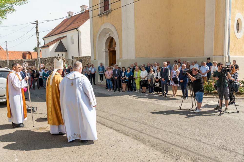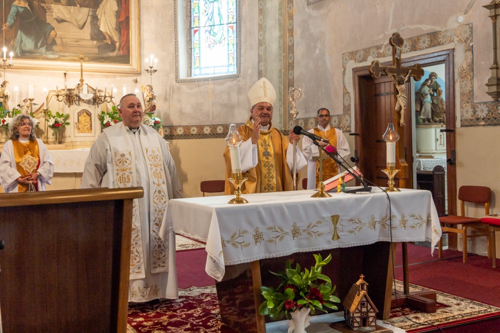 A liturgia előtt a főpásztor megáldotta a részlegesen felújított templomot, majd a bevonulást követően Vida Zsolt plébános köszöntötte a megjelenteket, köztük Soltész Miklós egyházi és nemzetiségi kapcsolatokért felelős államtitkárt, dr. Hargitai János országgyűlési képviselőt, Vidák Krisztina polgármestert, valamint a meghívott vendégeket és a közösség tagjait, majd ismertette a műemléki védettséget élvező, súlyosan leromlott állapotú templom 2023-ban megkezdett részleges felújítása során elvégzett munkálatokat.