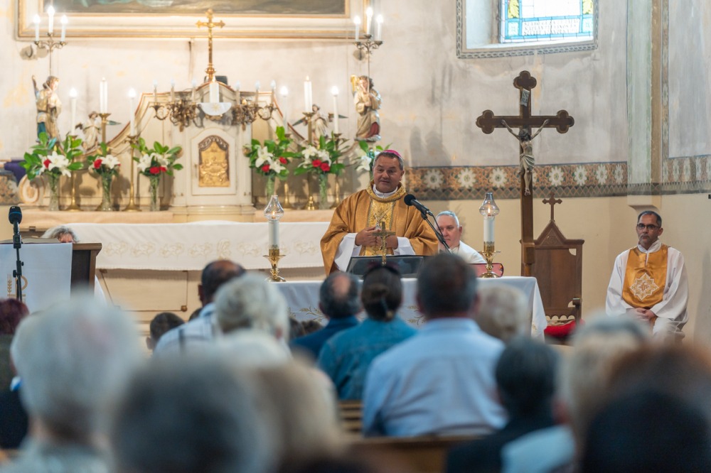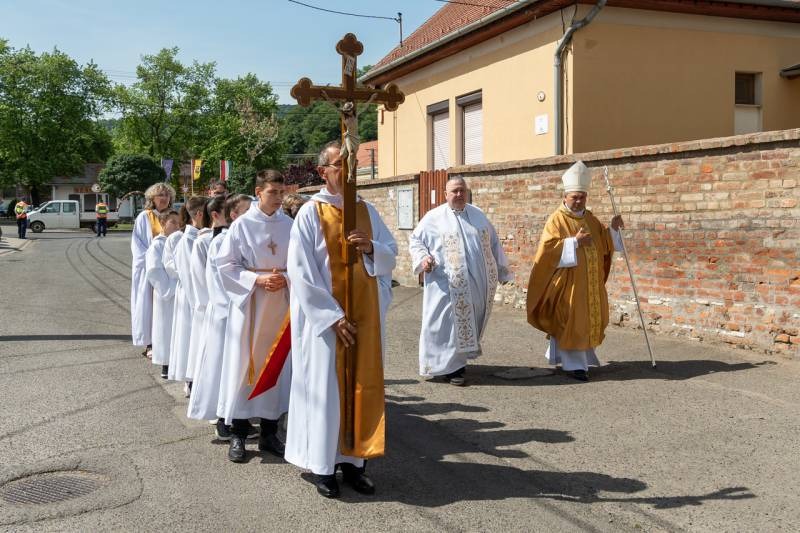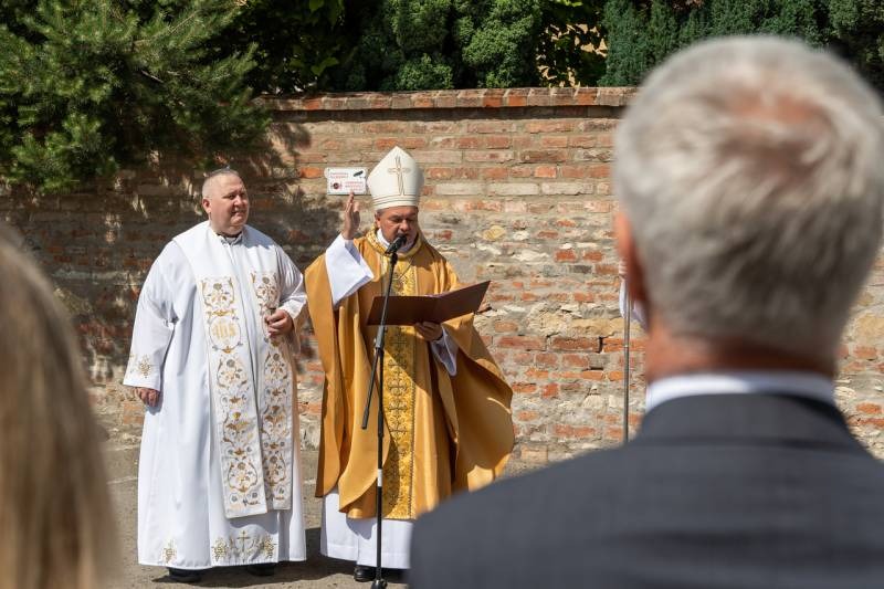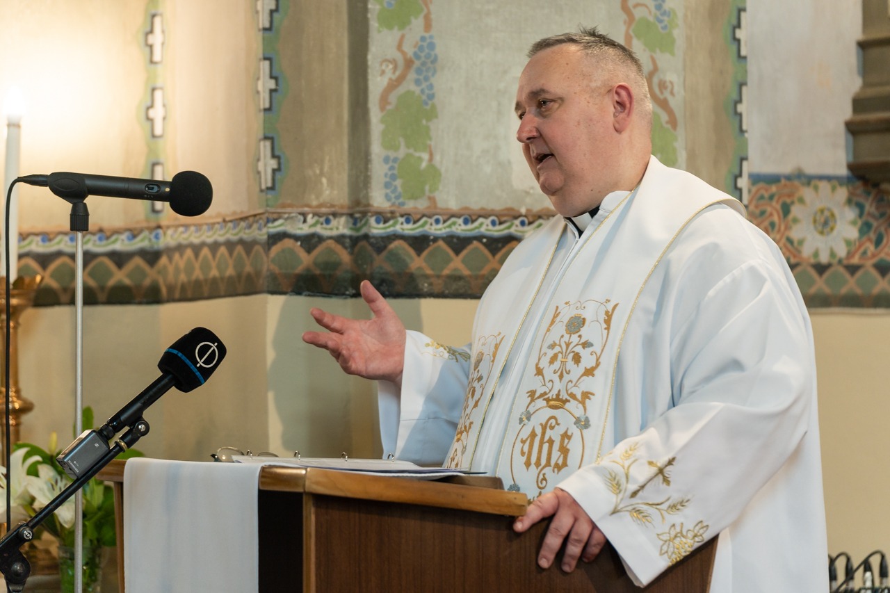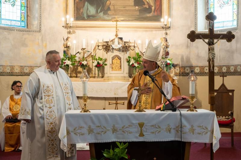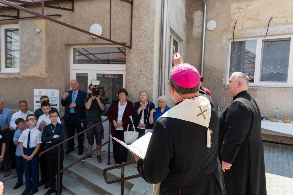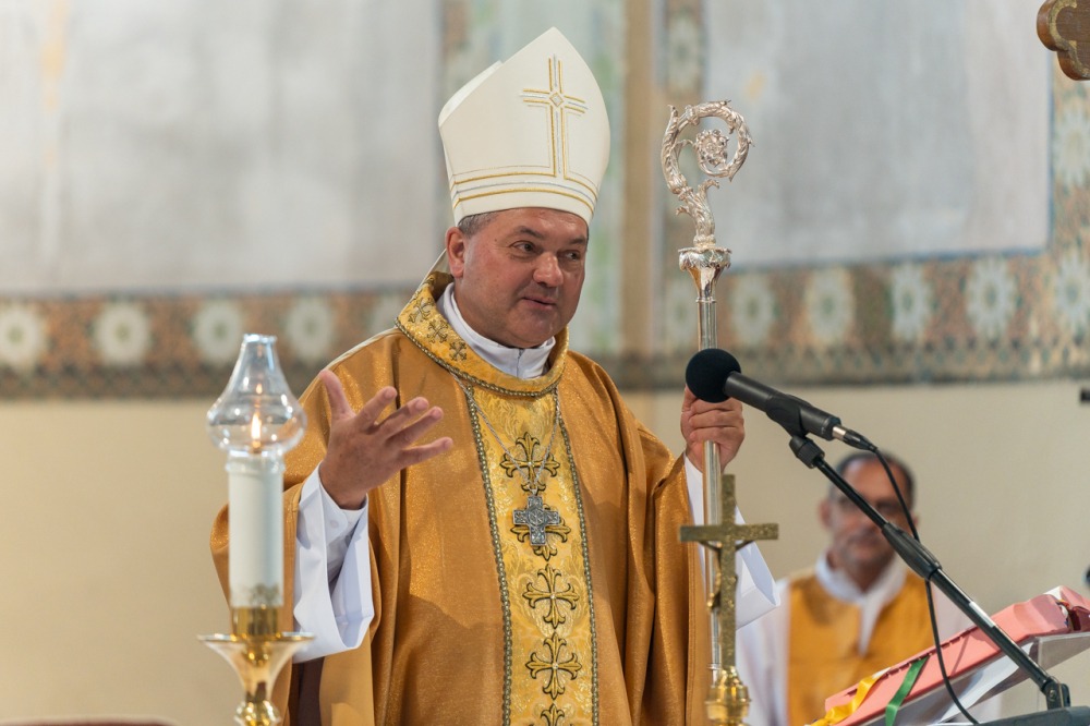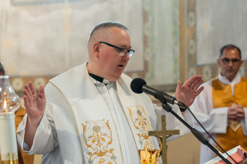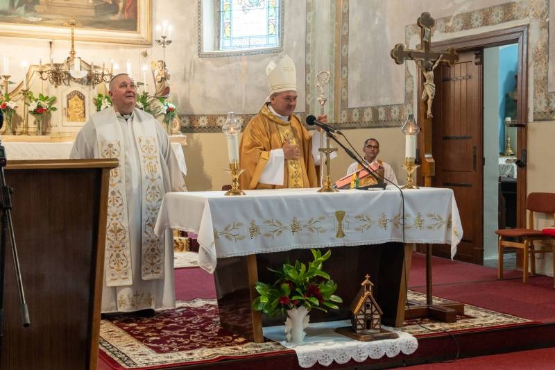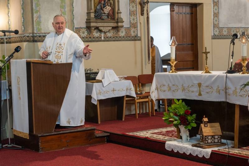 A liturgia előtt a főpásztor megáldotta a részlegesen felújított templomot, majd a bevonulást követően Vida Zsolt plébános köszöntötte a megjelenteket, köztük Soltész Miklós egyházi és nemzetiségi kapcsolatokért felelős államtitkárt, dr. Hargitai János országgyűlési képviselőt, Vidák Krisztina polgármestert, valamint a meghívott vendégeket és a közösség tagjait, majd ismertette a műemléki védettséget élvező, súlyosan leromlott állapotú templom 2023-ban megkezdett részleges felújítása során elvégzett munkálatokat.