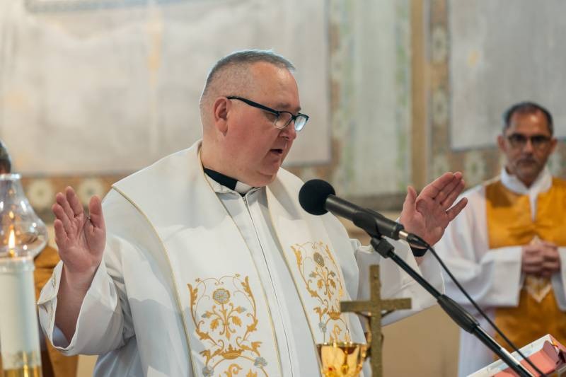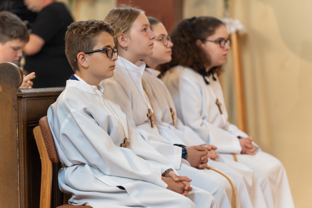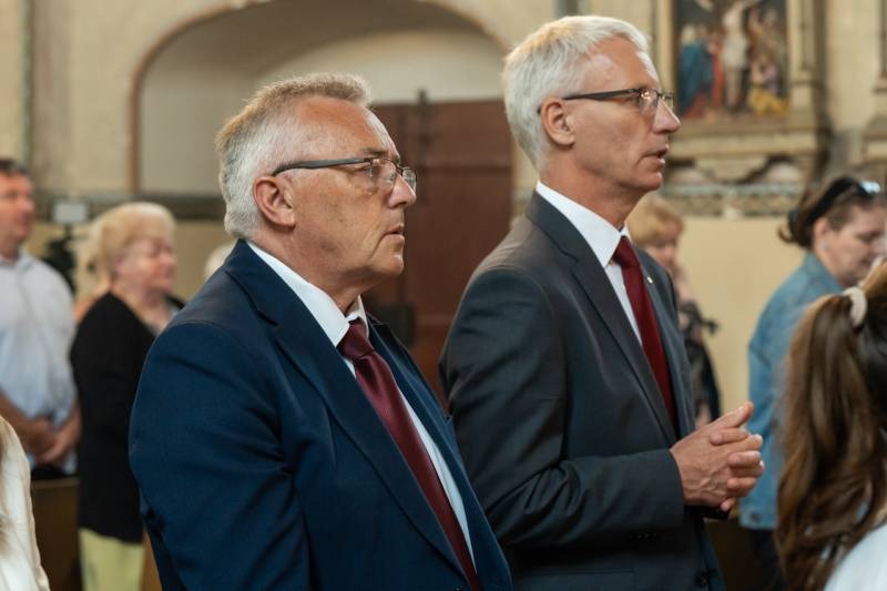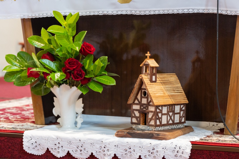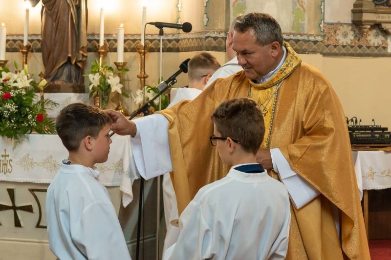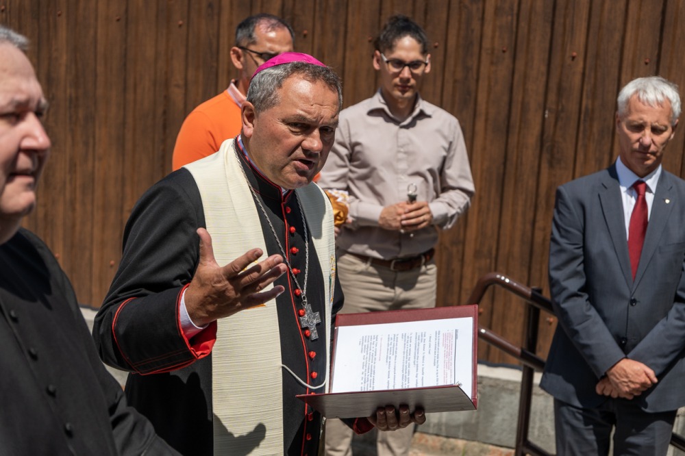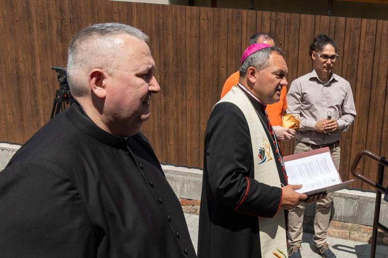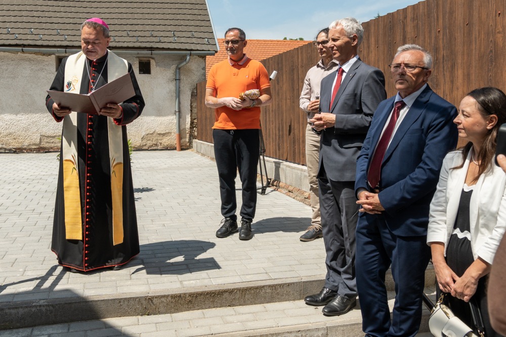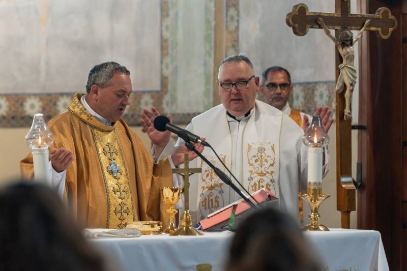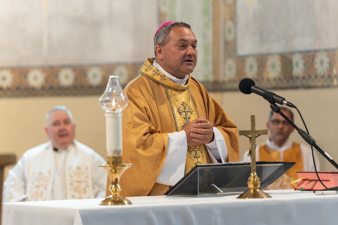 A liturgia előtt a főpásztor megáldotta a részlegesen felújított templomot, majd a bevonulást követően Vida Zsolt plébános köszöntötte a megjelenteket, köztük Soltész Miklós egyházi és nemzetiségi kapcsolatokért felelős államtitkárt, dr. Hargitai János országgyűlési képviselőt, Vidák Krisztina polgármestert, valamint a meghívott vendégeket és a közösség tagjait, majd ismertette a műemléki védettséget élvező, súlyosan leromlott állapotú templom 2023-ban megkezdett részleges felújítása során elvégzett munkálatokat.
