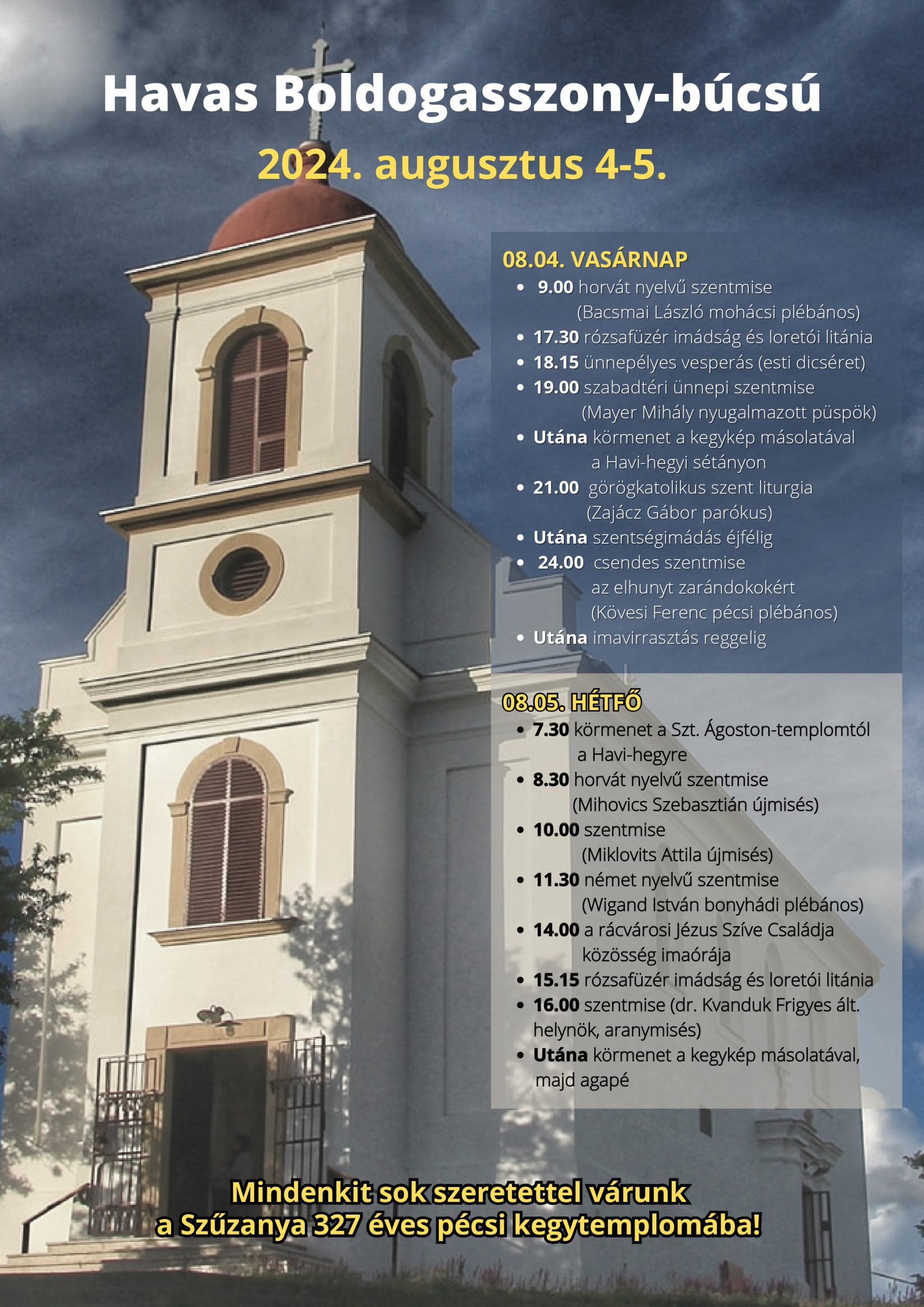 Idén is kétnapos búcsún, augusztus 4-én és 5-én ünneplik Pécsen a Havas Boldogasszony-templom búcsúját. Az ilyenkor hagyományos püspöki szentmisét ebben az évben Mayer Mihály nyugalmazott püspök celebrálja, de lesz liturgia horvát és német nyelven, valamint az újmisés papok is celebrálnak szentmisét a Havi-hegyen.