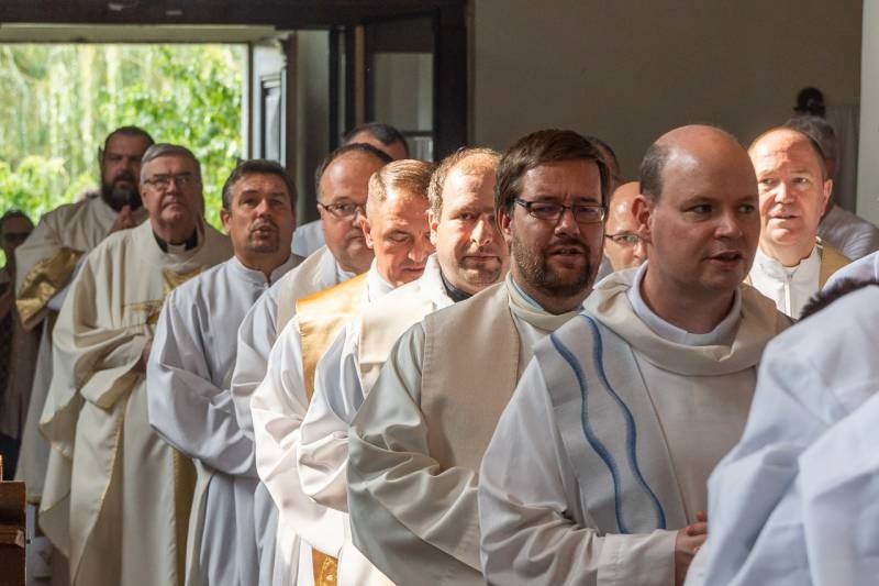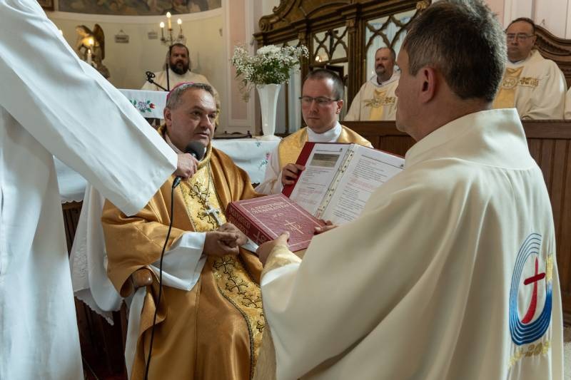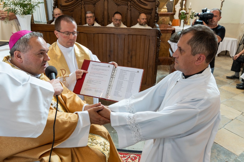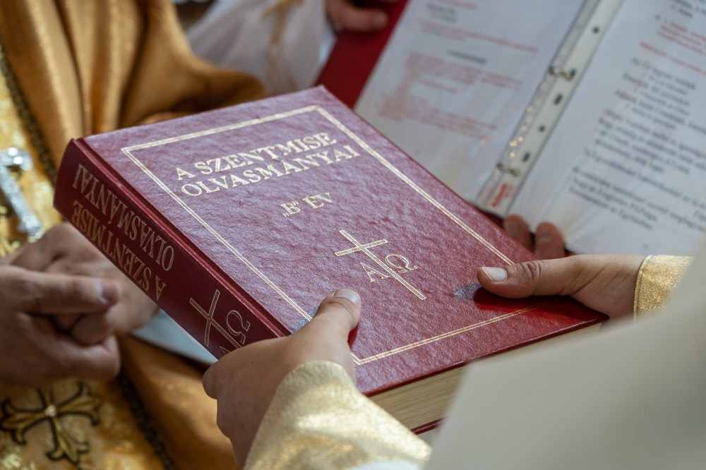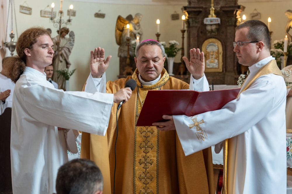 Ezt követte a beöltözés szertartása, valamint az evangéliumos könyv, mint az igehirdetés szimbólumának átadása: „Vedd Krisztus evangéliumát, amelynek hirdetője lettél! Ügyelj arra, hogy amit olvasol, hidd; amit hiszel, tanítsd, és amit tanítasz, kövesd is” – mondta az immár állandó diakónusi szolgáltra felszenteltnek a püspök.