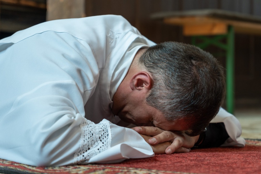 A szentbeszéd után a szentelési szertartásban az ünnepélyes ígérettételt követően a szentelendő arcra borulva, míg a hívek térdelve énekelték a mindenszentek litániáját, amit a felszentelés szertartása követett, melyben a püspök kézrátétellel adta tovább a jelöltnek az apostoloktól kapott lelki hatalmat.