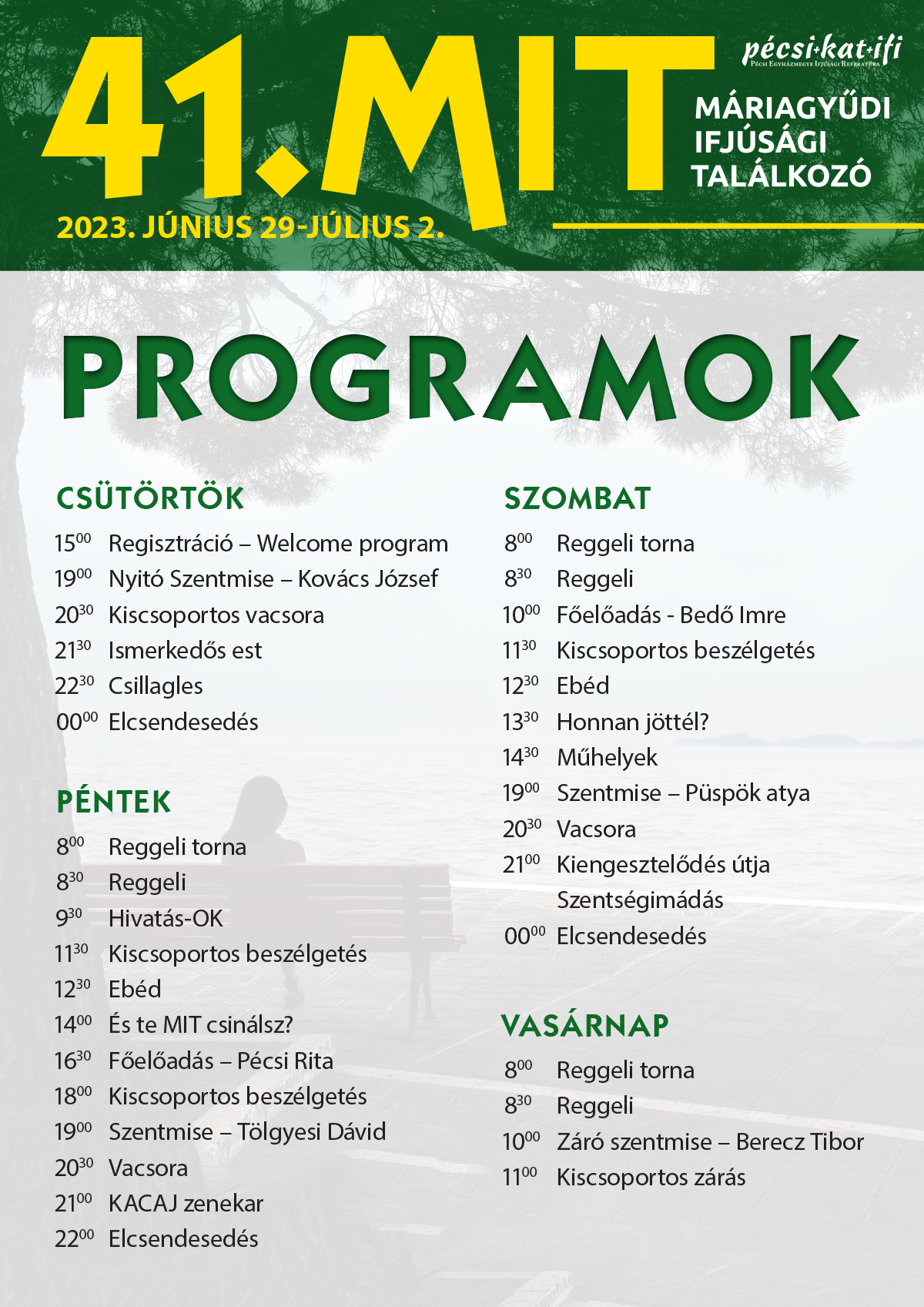 - Július 1. szombat: 10:00 Bedő Imre előadása, délután műhelyek, kiscsoportos beszélgetések, találkozás püspök atyával, 19:00 püspöki szentmise, kiengesztelődési est, szentségimádás