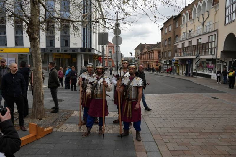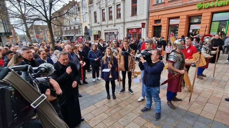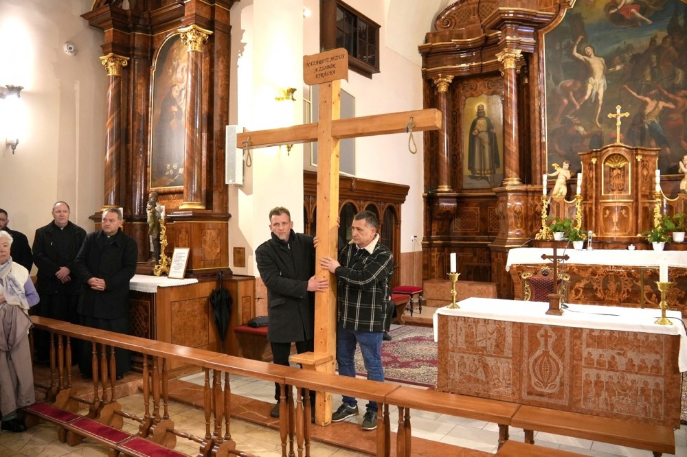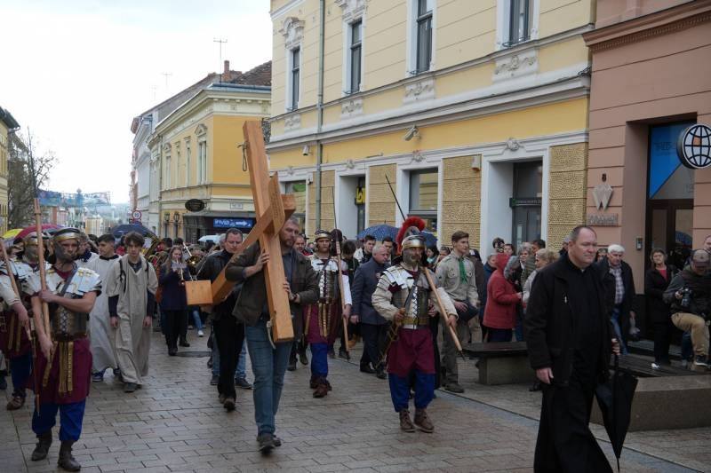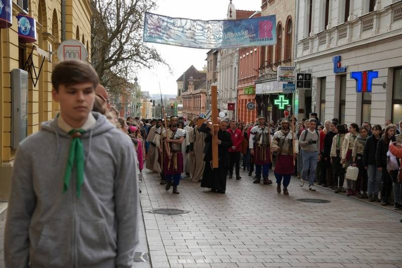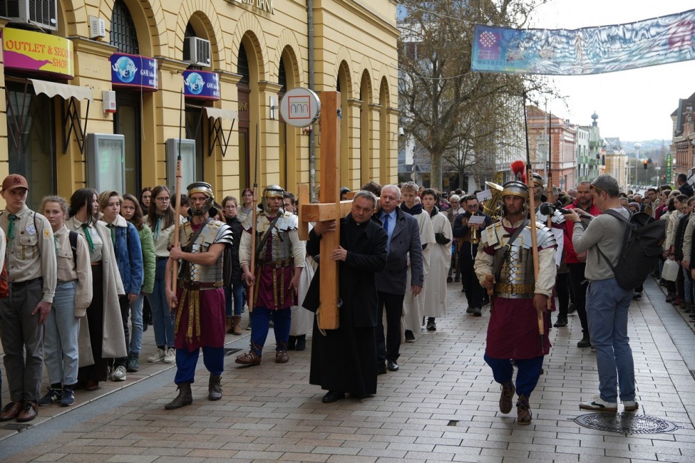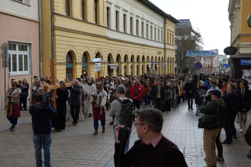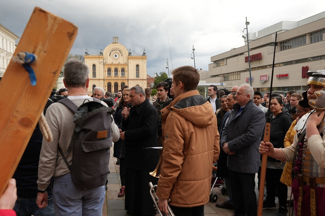 Felföldi László pécsi megyéspüspök a Kossuth téren, indulás előtt úgy fogalmazott, hogy minden ember életének legnagyobb feladata, hogy szenvedéstörténetét elhelyezze a saját vállán. Az életünk derűje és öröme az, hogyan visszük a keresztünket, nem az, hogy van-e, mert mindenkinek van – mutatott rá a püspök.