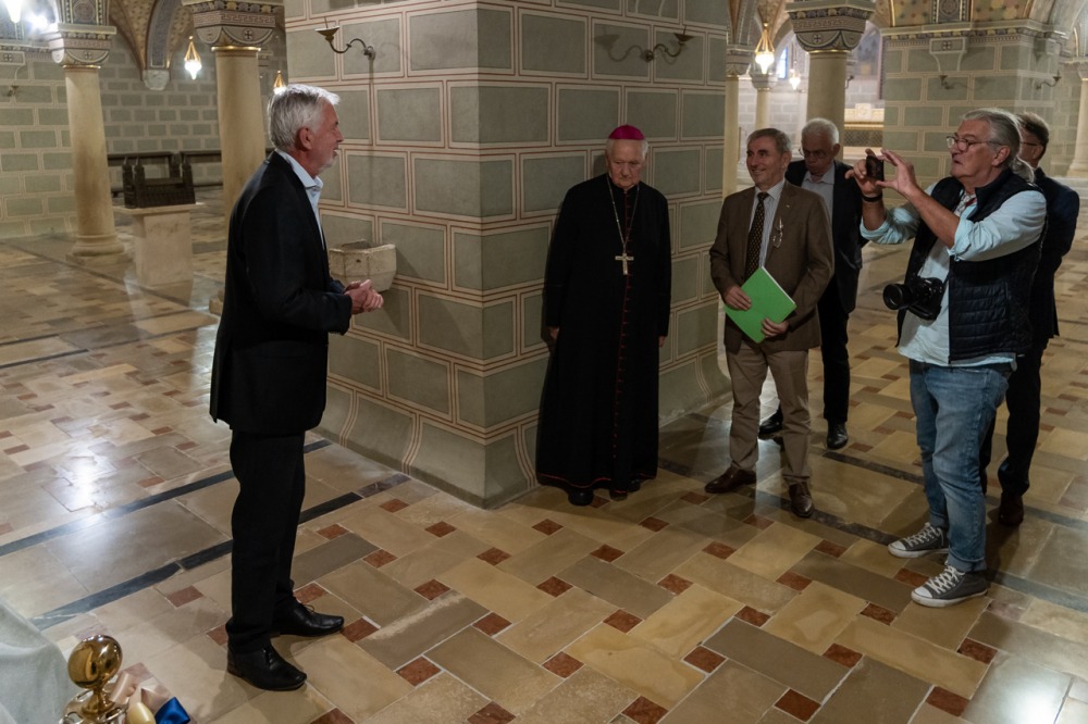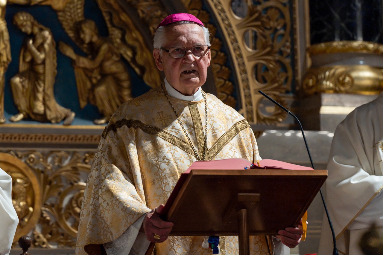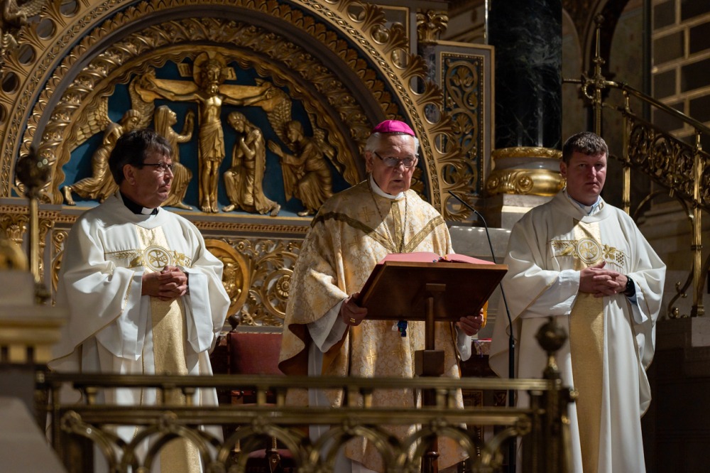 A szertartáson Mayer Mihály nyugalmazott püspök német nyelven köszöntötte a Pécsi Püspöki Hittudományi Főiskola által szervezett, a szentmise időpontjában Pécsen zajló nemzetközi konferencia szentmisére ellátogatott résztvevőit.