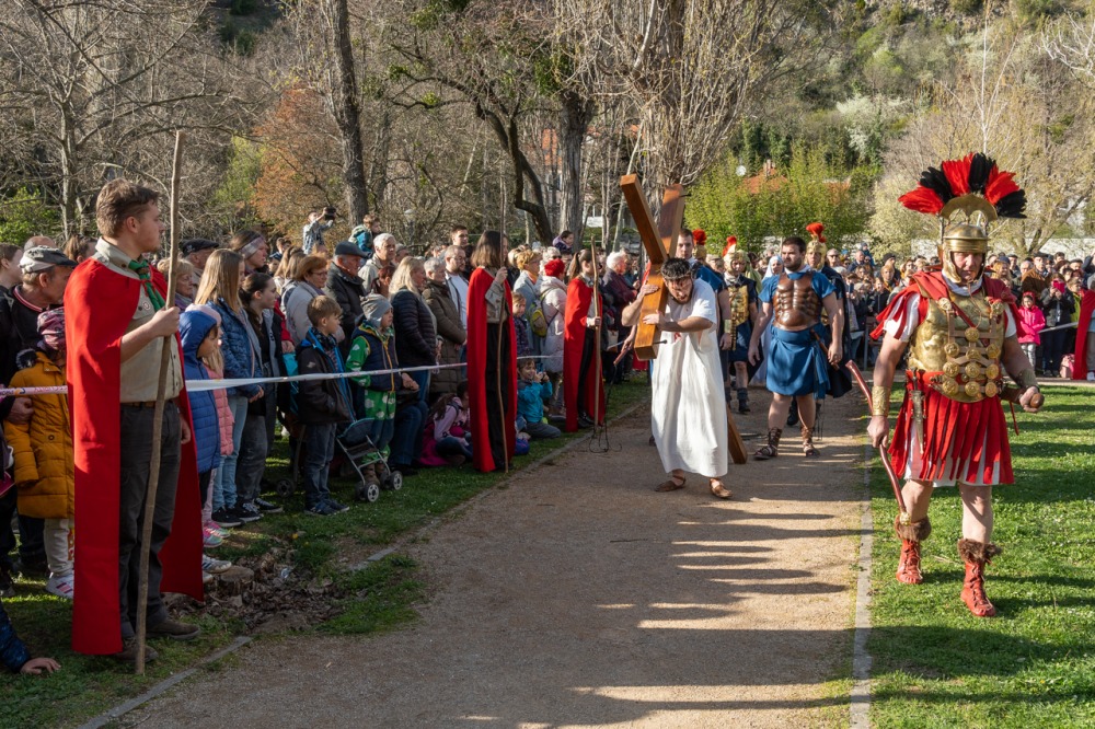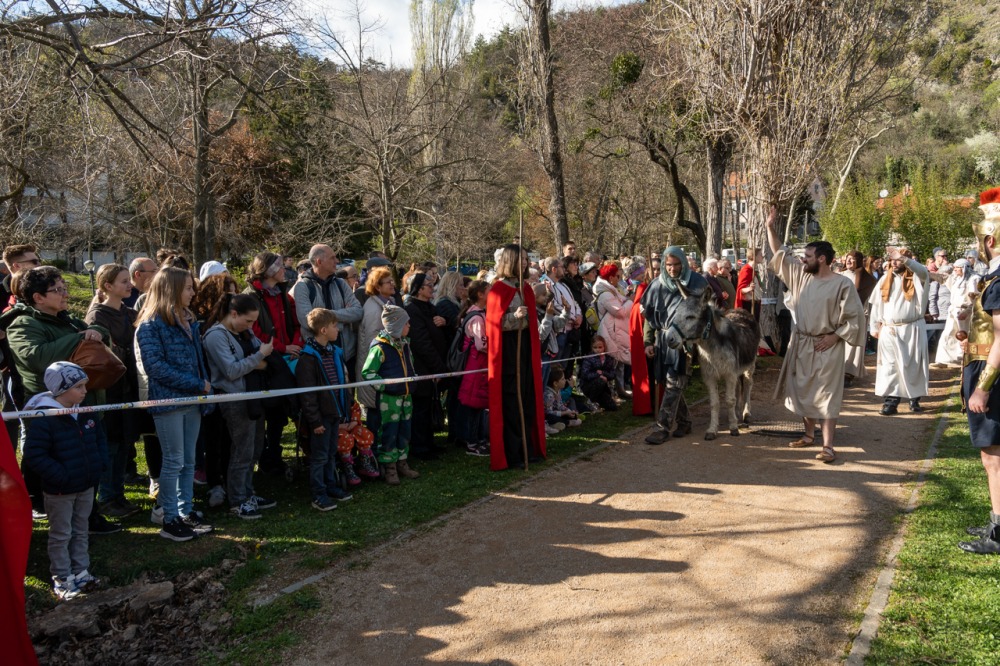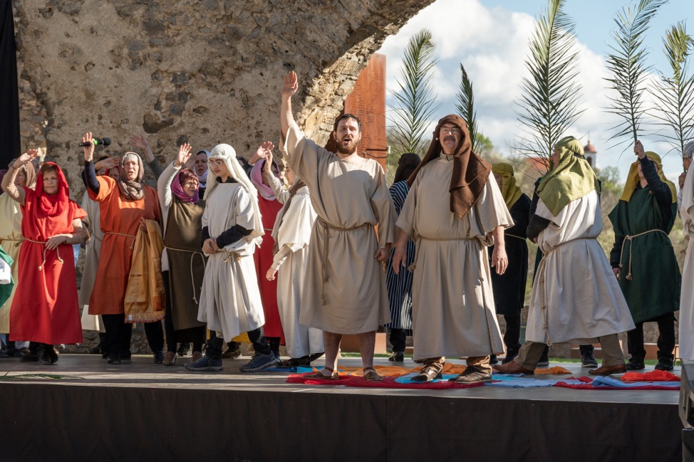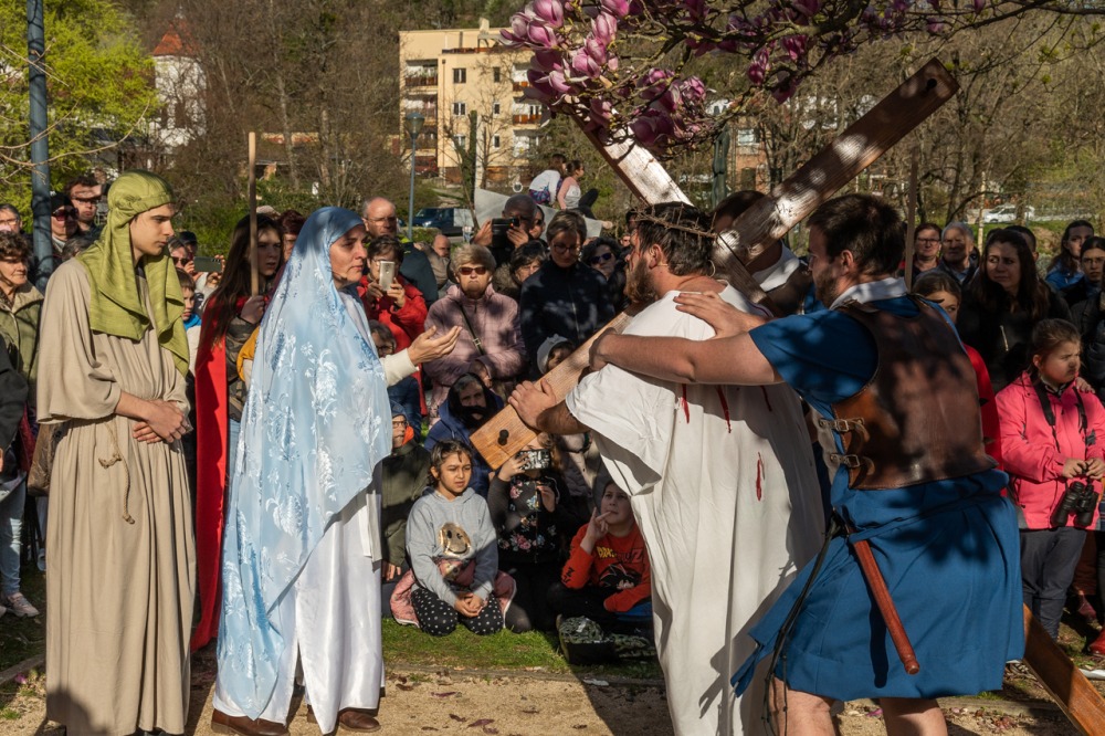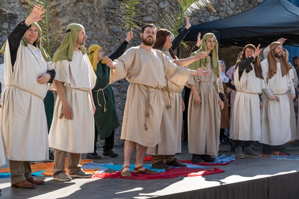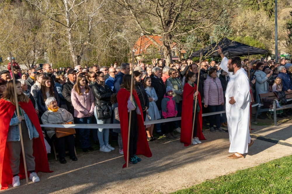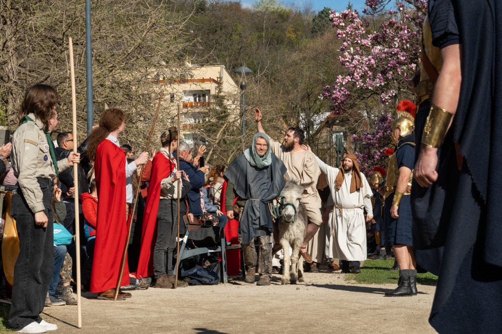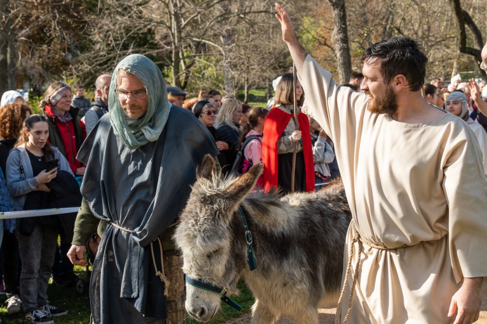 A jeruzsálemi bevonulástól Jézus kereszthaláláig és feltámadásig mutatták be a nagyhét eseményeit március 24-én, virágvasárnap a látogatókkal és érdeklődőkkel megtelt pécsi Tettye-parkban, ahol Felföldi László pécsi megyéspüspök köszöntötte a megjelenteket.