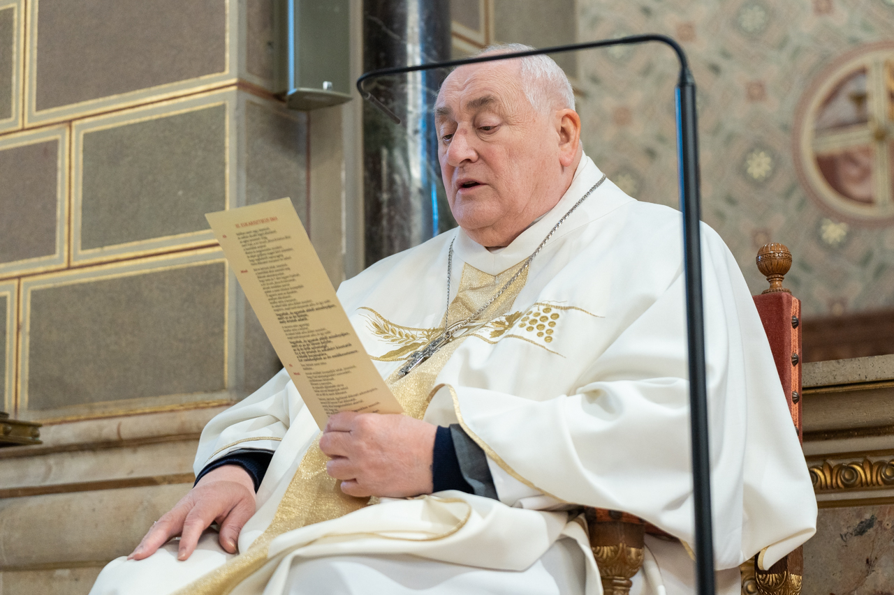 Nagycsütörtök délelőtt olajszentelési szentmisét celebrált Felföldi László pécsi megyéspüspök Mayer Mihály nyugalmazott püspökkel, Bíró László nyugalmazott tábori püspökkel és az egyházmegye papságával Pécsen, a Szent Péter- és Szent Pál-székesegyházban.