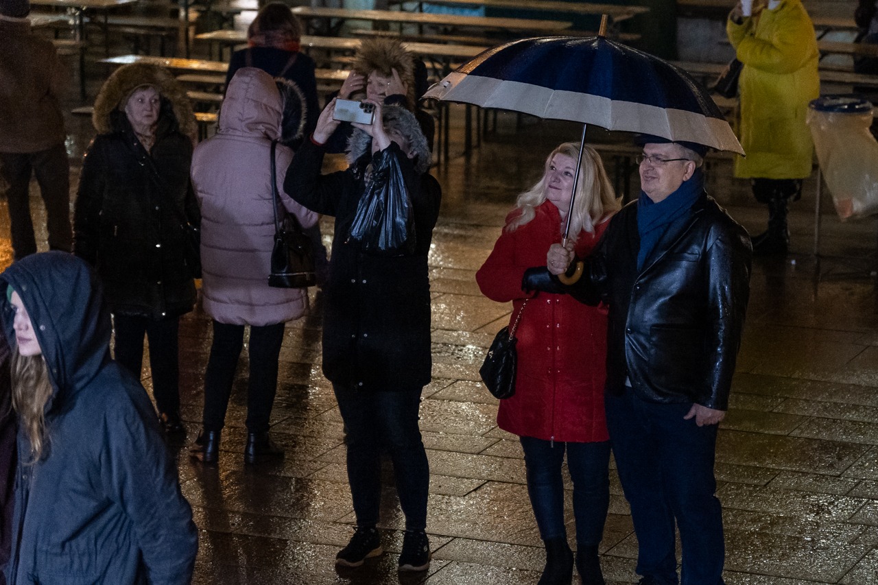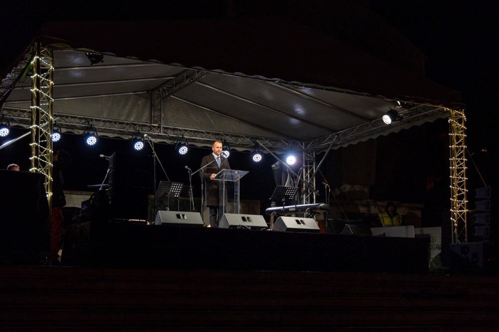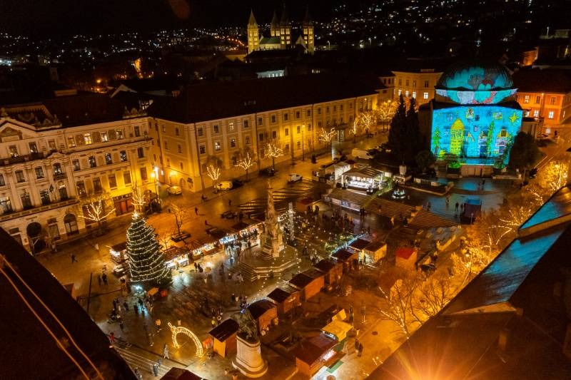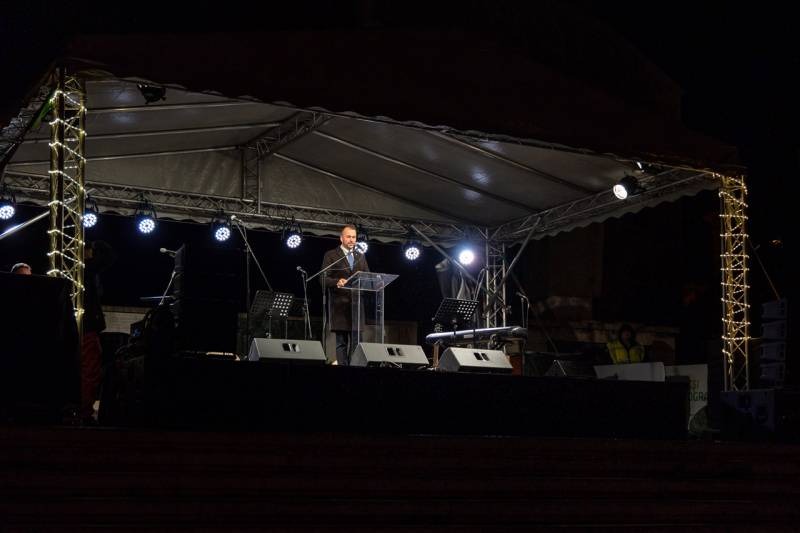 Az ünnepi fények felkapcsolását követően ünnepi díszbe öltözött pécsi főtéren Máger Róbert beszédében kiemelte, hogy a Megváltó születésének ünnepére való készület reménnyel tölt el mindnyájunkat és ennek az idén különleges aktualitása van.
