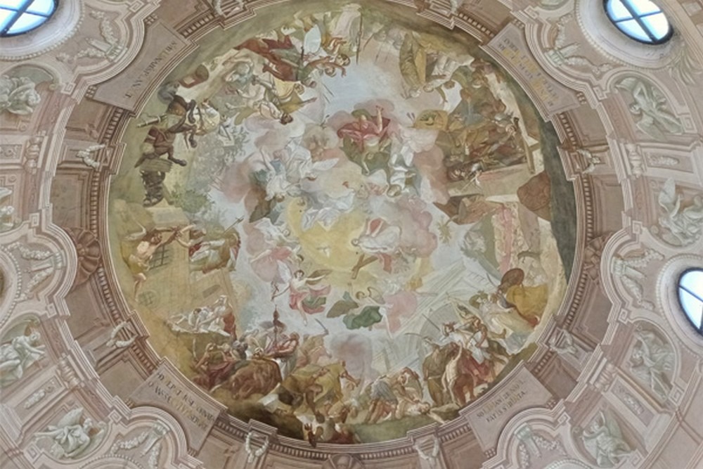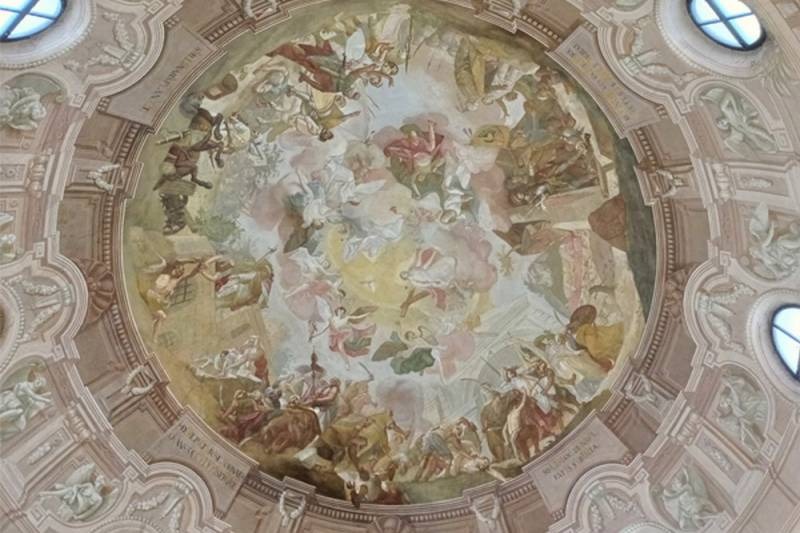 A bejárat felől nézve barokk stílusú Szent Rókus Plébániatemplom 1580-ban épült Ali pasa egykori dzsámijaként. Az épület felszentelése az 1710-es években történt, amikor egész Európában, Magyarországon is pestijárvány dúlt. A járványnak tudható be, hogy a templom védőszentjének Szent Rókust választották, aki betegeket ápolt és a gyógyulás reményében fohászkodtak hozzá. A század utolsó negyedére fejeződött be barokk templommá való átépítése. A kupola belsejére ekkor festette meg Dorfmeister István a Szigetvár elestét és visszafoglalást megörökítő monumentális freskóját. A falfestmény nagy részén történelmi események ábrázolását, földi jeleneteket látunk, amellyel a művész a nemzeti érzést erősíti. A belső körben látható égi jelenet középpontjában a Szentháromság galambja látható, alatta angyalok lebegnek, s Szűz Mária jelenik meg a felszabadító vezér felett, hogy ismét védelmébe vegye a nemzetet.