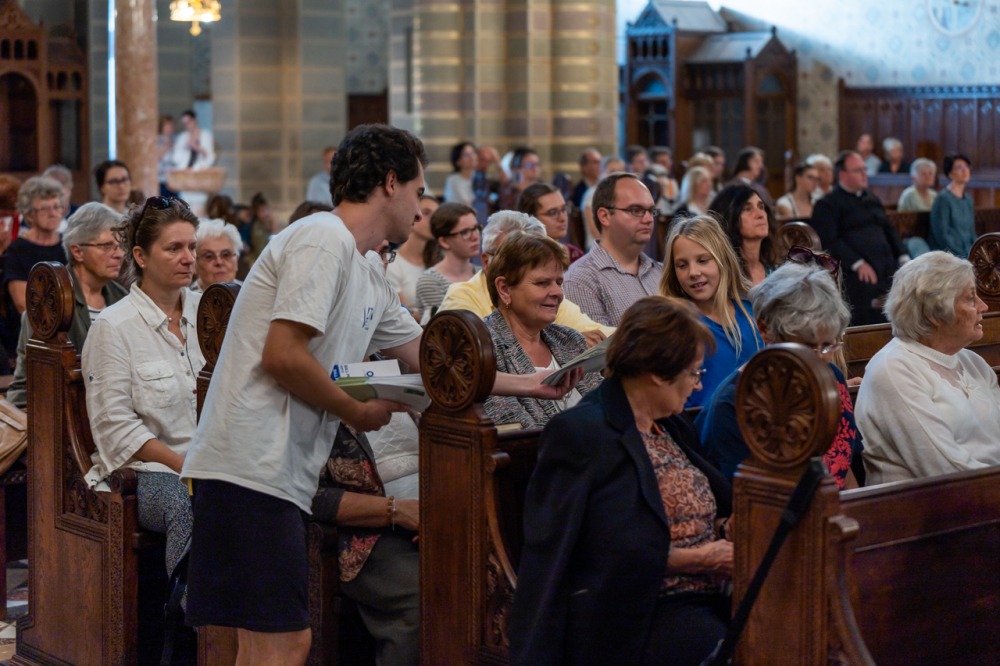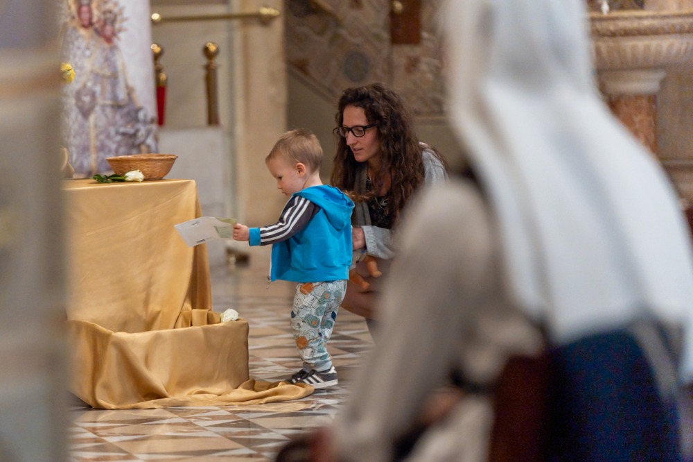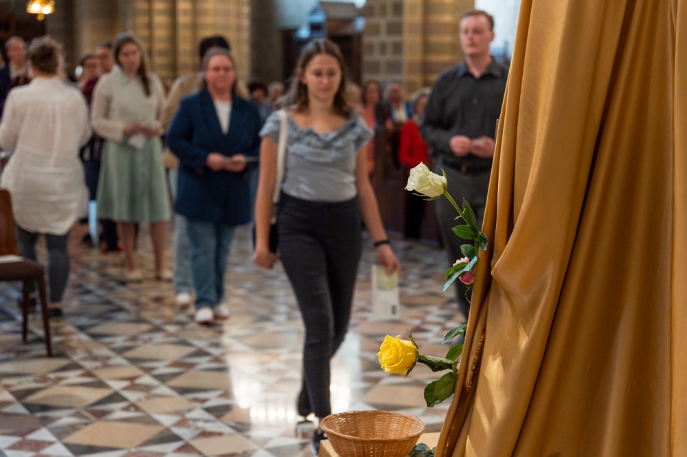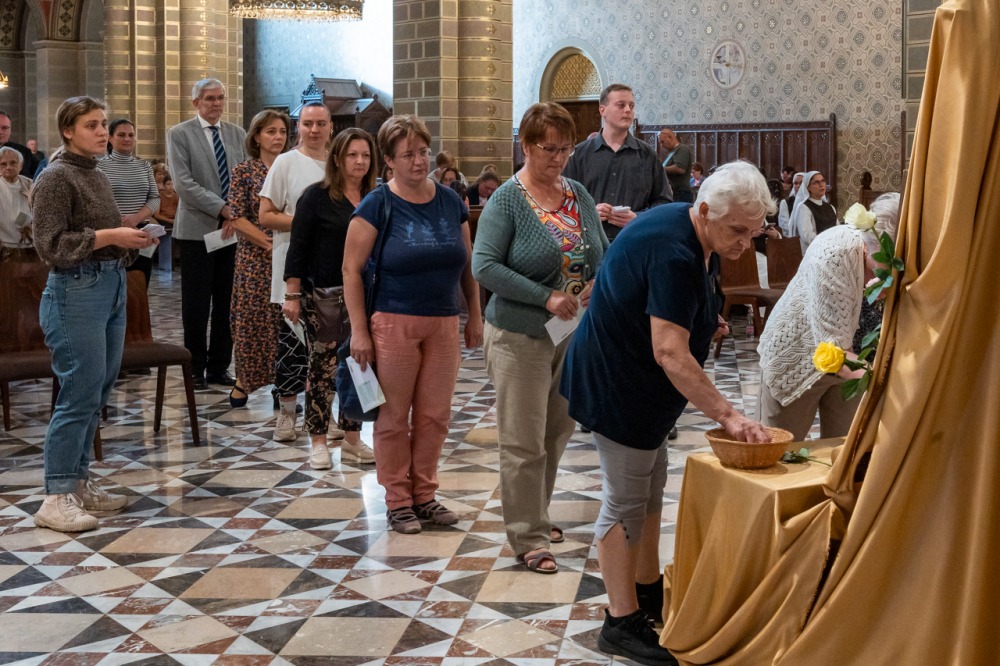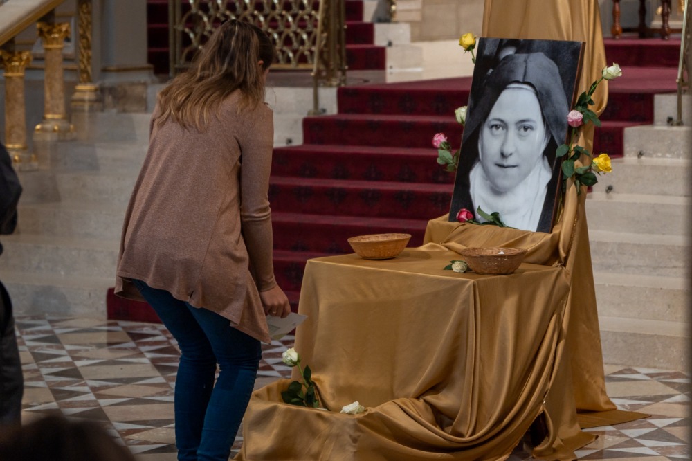 A tavalyi évhez hasonlóan idén is megtöltötték a székesegyházat a Pécsről és környékéről, Kaposvárról és Homokkomáromból érkezett felnőttek, fiatalok és gyermekek, akiket a Nyolc Boldogság Közösség pécsi alapítása képviseletében Valter Margit nővér köszöntött Lisieux-i Kis Szent Teréz virágokkal díszített portréja előtt.