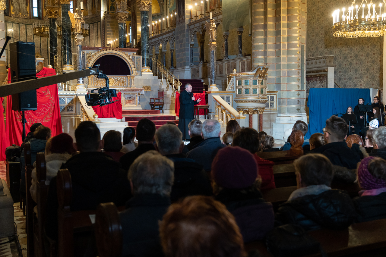Felföldi László pécsi megyéspüspök köszöntötte a megjelenteket, köztük az egyházi és közjogi tisztségviselőket. Az érdeklődők zsúfolásig megtöltötték a székesegyház épületét. Teltház, a látottak okán mindvégig tapintható feszültség, megrendültség és visszatérő vastaps kísérte az előadást, melyben a Megváltó Krisztus értünk vállalt passiójának pillanatképei elevenedtek meg.