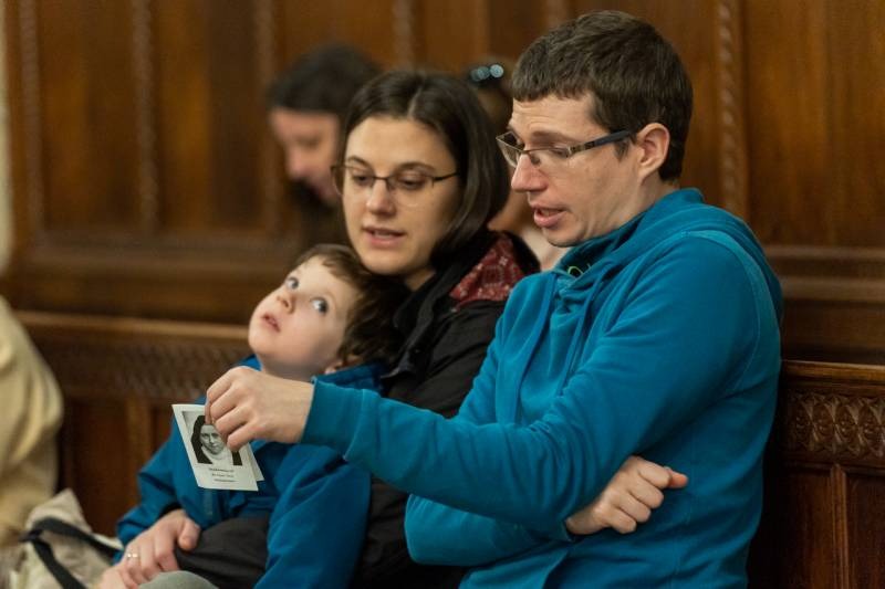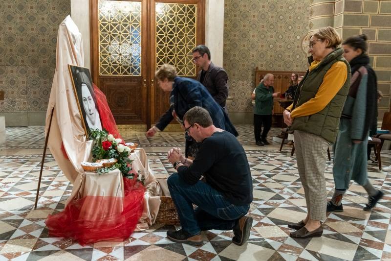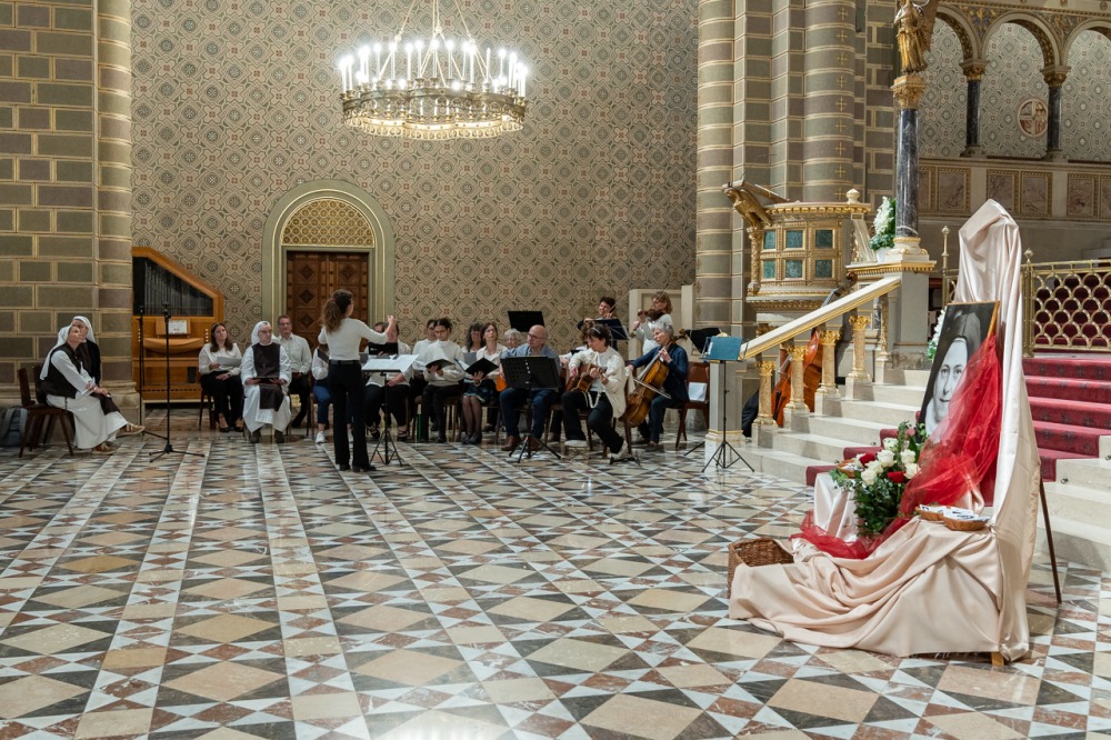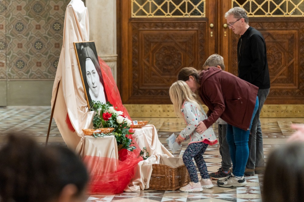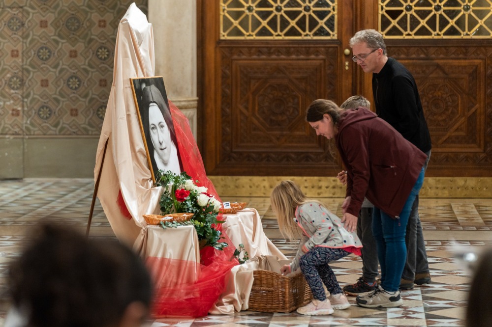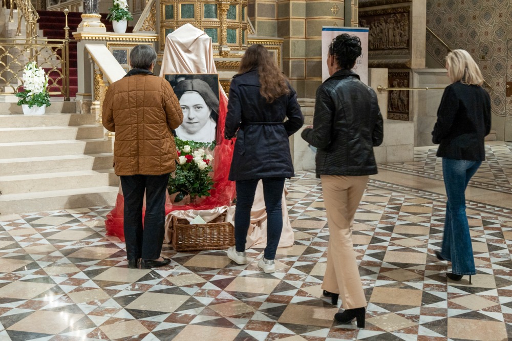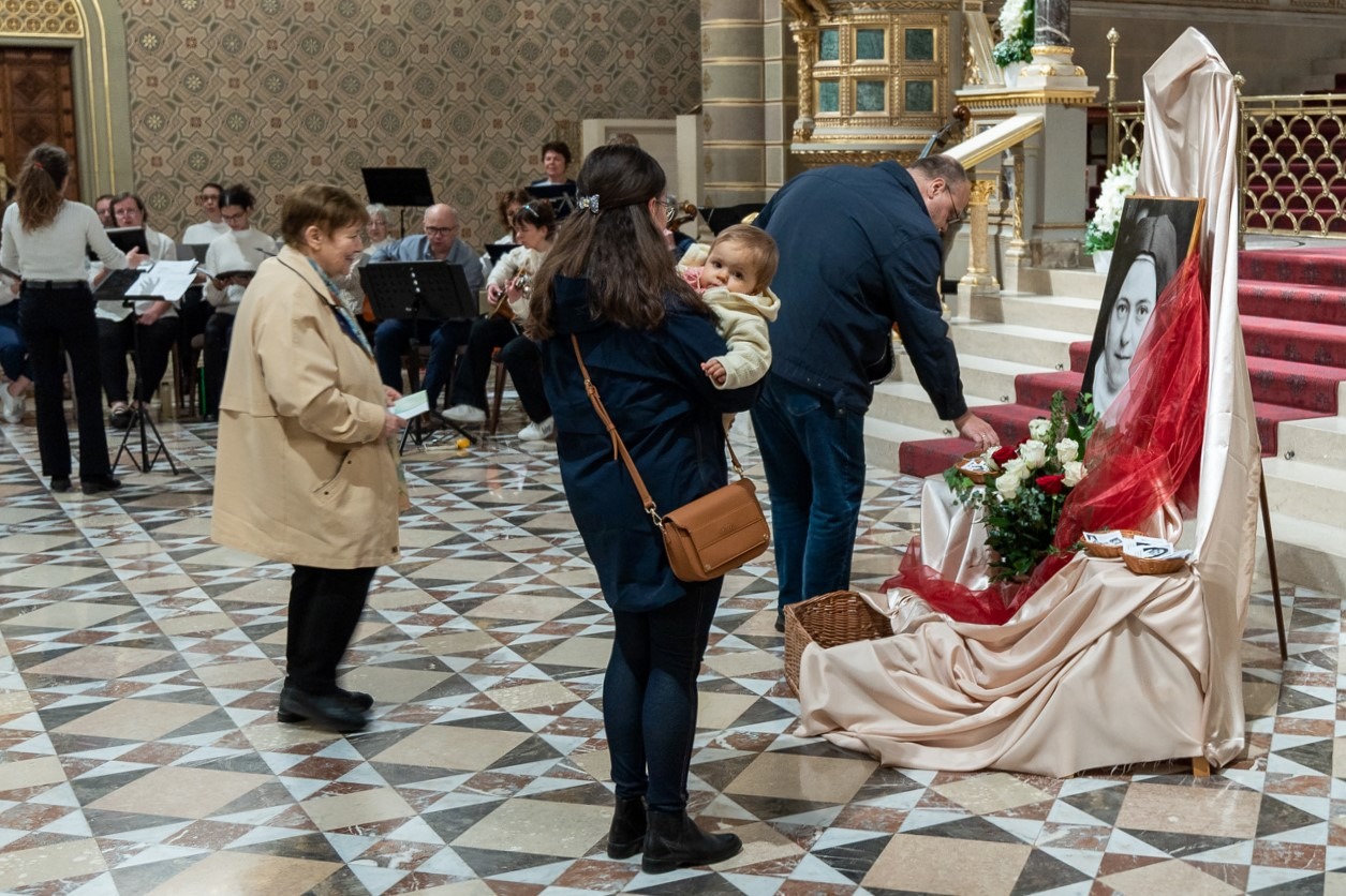 A fiatalokat és idősebbeket, családokat és egyedül érkezetteket Valter Margit nővér köszöntött Lisieux-i Kis Szent Teréz rózsacsokorral díszített portréja előtt.