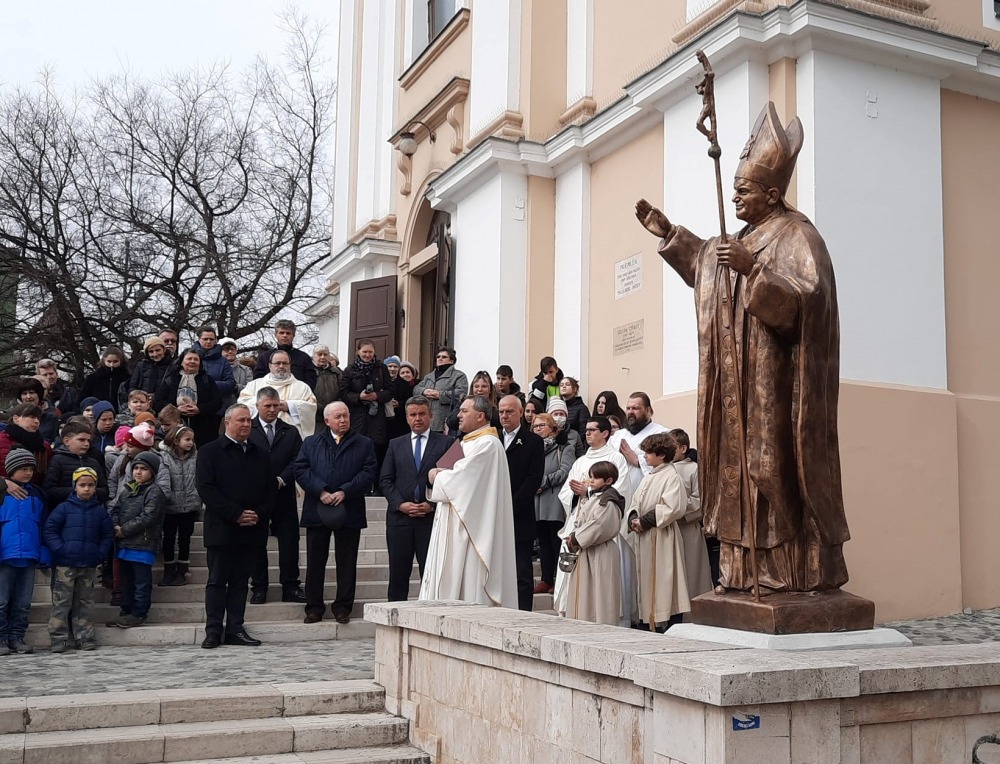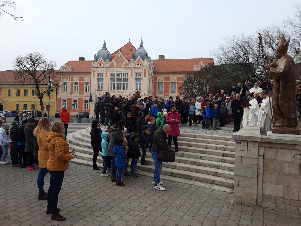 A liturgiát követően Felföldi László megáldotta Szent II. János Pál pápának az Urunk Mennybemenetele templom előtti téren felállított egész alakos szobrát, mely Rózsa László, a Váci Egyházmegye tolnai születésű állandó diakónusa nagylelkű felajánlásának köszönhető. A szobor talapzatára hamarosan tábla kerül, melyre a Ne féljetek! feliratot vésik majd fel. Pápává választása után II. János Pál hívekhez intézett első mondata így hangzott: „Ne féljetek!”. A félelem leküzdésében nagy ereje van az imádságnak, a mély istenkapcsolatnak, mely a pápát is elkísérte kicsiny gyermekkorától egészen a haláláig. „Ne féljetek! Merjetek álmodni! Merjetek elindulni! Ne féljtsétek az életeteket Istentől! A szent pápa egykori gondolatának ma is ez az élő üzenete. Erre gondoljatok, amikor a téren átkelve rápillantotok a szoborra” – fordult a diákokhoz a püspök.