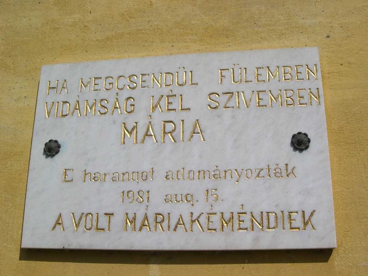 Jelenleg a máriakéméndi Nagyboldogasszony-kegytemplom tornyában két harang lakik. A nagyharangot, mely 590 kg súlyú, 1958-ban öntötték és Máriakéméndről elszármazott németek adományozták a templomnak 1981-ben. Akkor készült el a szerkezet villamosítása is. Minderről egy, a torony falán elhelyezett emléktábla is tanúskodik. A harang megáldására mintegy 2000 fő gyűlt össze 1981. augusztus 15-én, Nagyboldogasszony napján, a templom búcsúünnepén. A szabadtéri szentmisét a harangtorony előtt, a keresztútnál mutatták be és Cserháti József, akkori pécsi megyéspüspök celebrálta.