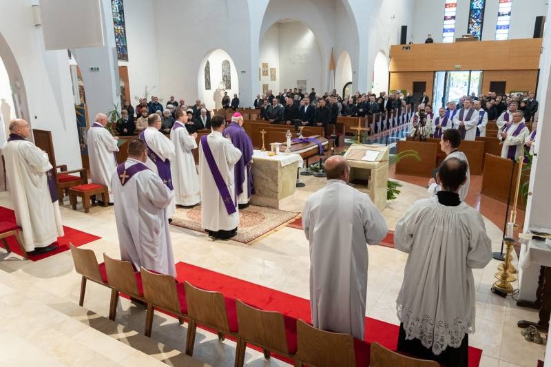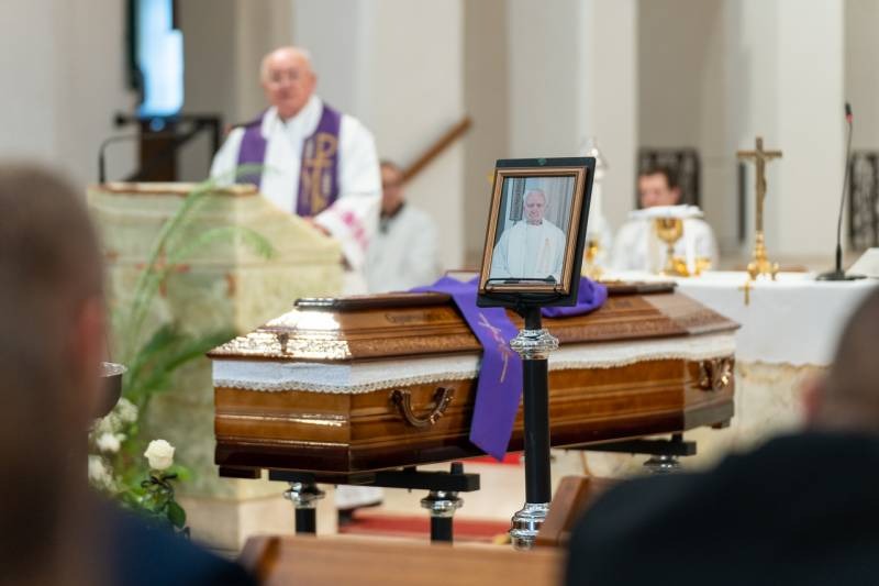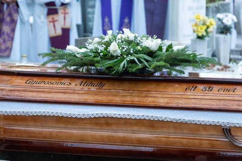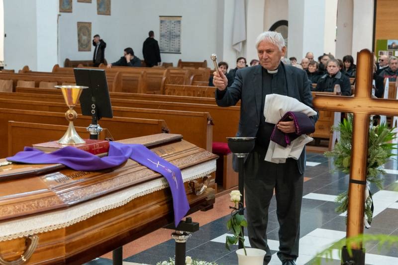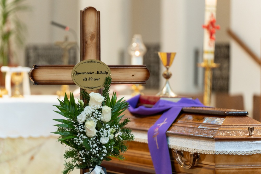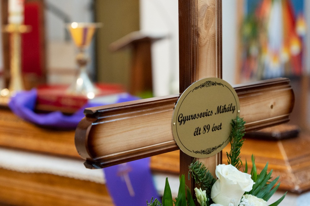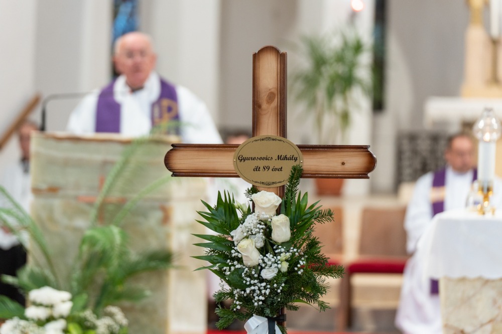 A Fogadalmi templom oltára előtt ravatalozták fel a lila színű papi stólával letakart koporsót, melyre az idei liturgikus év misekönyvét és Mihály atya misézőkelyhét helyezték. A szentmise kezdetén a harangok Gyurosovics Mihály atyáért szóltak.