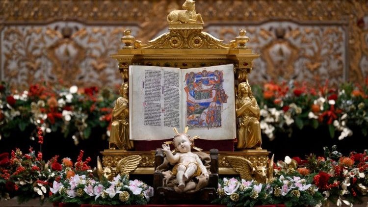 Az ünnepi karácsony éjjeli szentmise záróaldását követően a Szentatya tolószékében ölbe véve a Kisjézus szobrát, a világ öt kontinensét jelképező gyermekek kiséretében, a bazilika oldalhajójában található Betlehemhez vitte és a diakónus ott helyezte el a Kisdedet.