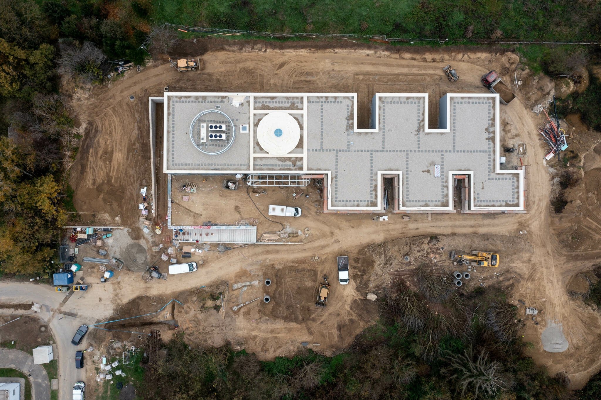A projekt zöldmezős beruházásban Dombóvár nyugalmas, zöldövezeti részén egy 8276 négyzetméteres telken valósult meg. 2023 novemberében egy fákkal, bokrokkal dúsan benőtt délről északi irányba lejtő munkaterületet vettek át a kivitelező cég szakemberei. Az építést megelőzően megtisztították a területet a bozóttól és elvégezték az épület geometriai kialakításának megfelelően a tereprendezési munkákat. Utóbbi – árulta el Ihász László – mintegy 7000 köbméter föld megmozgatását jelentette. A kitermelt föld egy részét az épület melletti tereprendezéshez használták fel, a többit egy lerakóhelyre szállították.